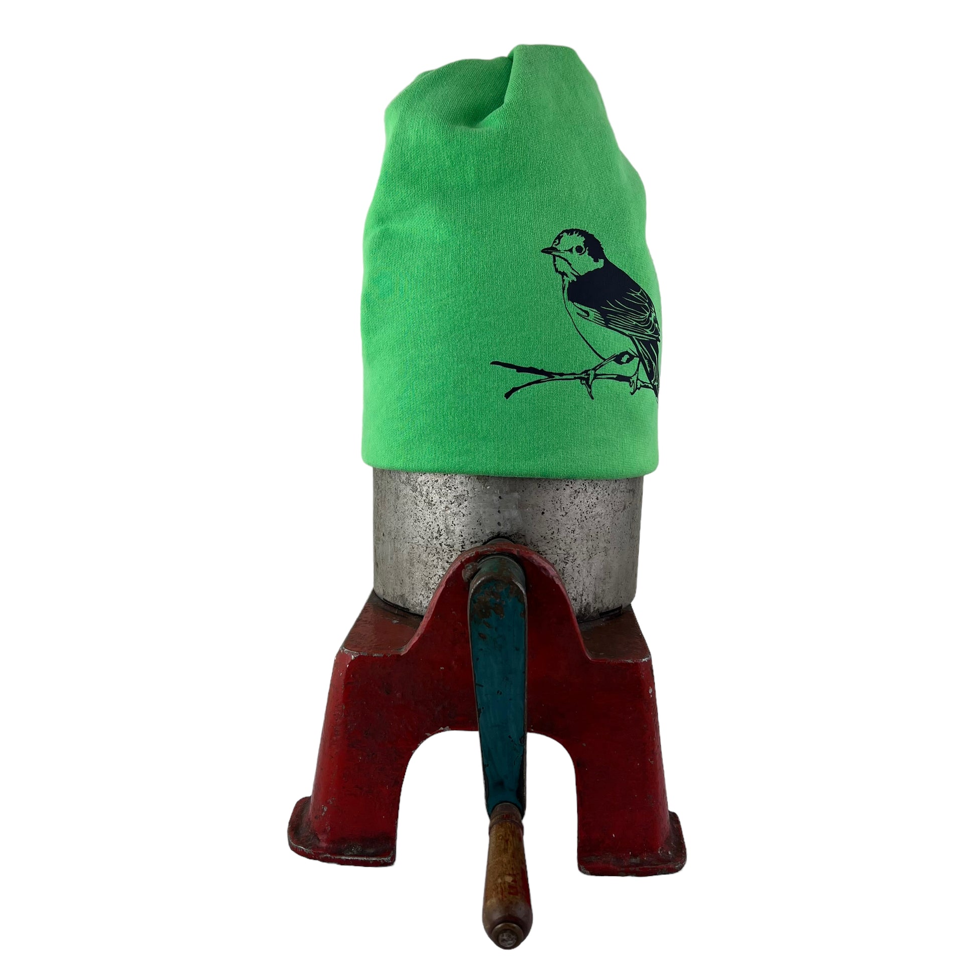 This double layer apple green slouchy toque is made from a 100% cotton brushed fleece fabric. I dye the fabric in small batches of three hats. The small bird on a branch was created by me and transferred onto the right side of hat.
