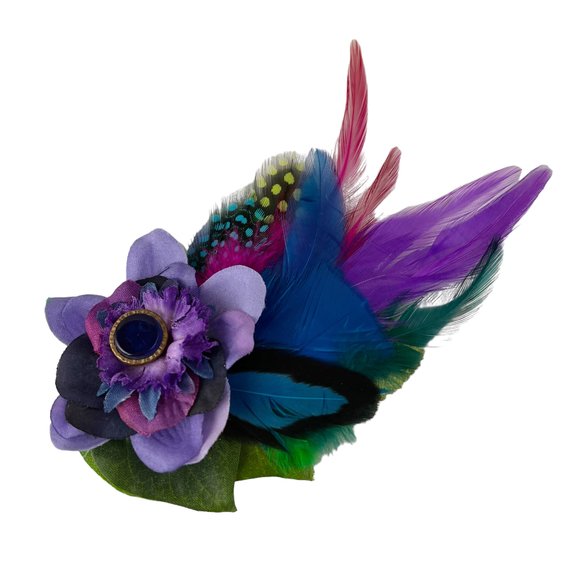 This hand made small mauve purple turquoise blue flower feather hair clip is one of a kind. It was designed to compliment an persons outfit color as an hair accent. The antique glass inset waistcoat button circa 1880s, comes from my own treasured button collection.