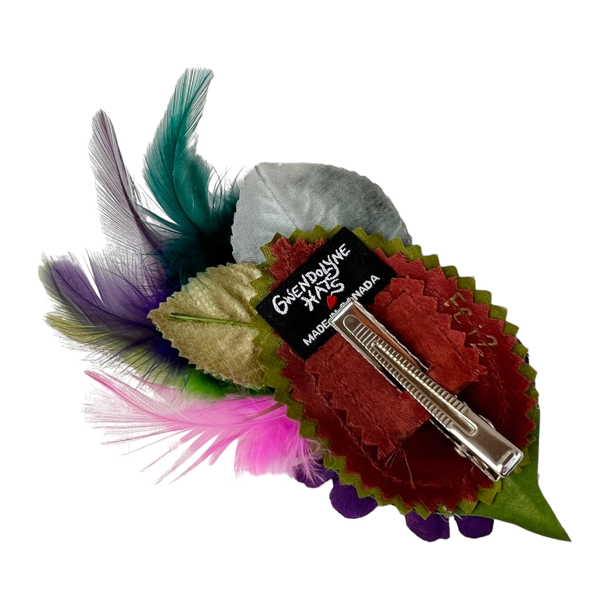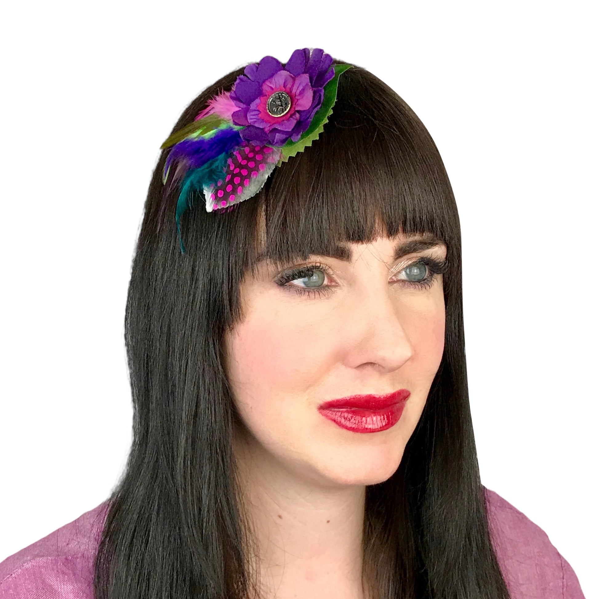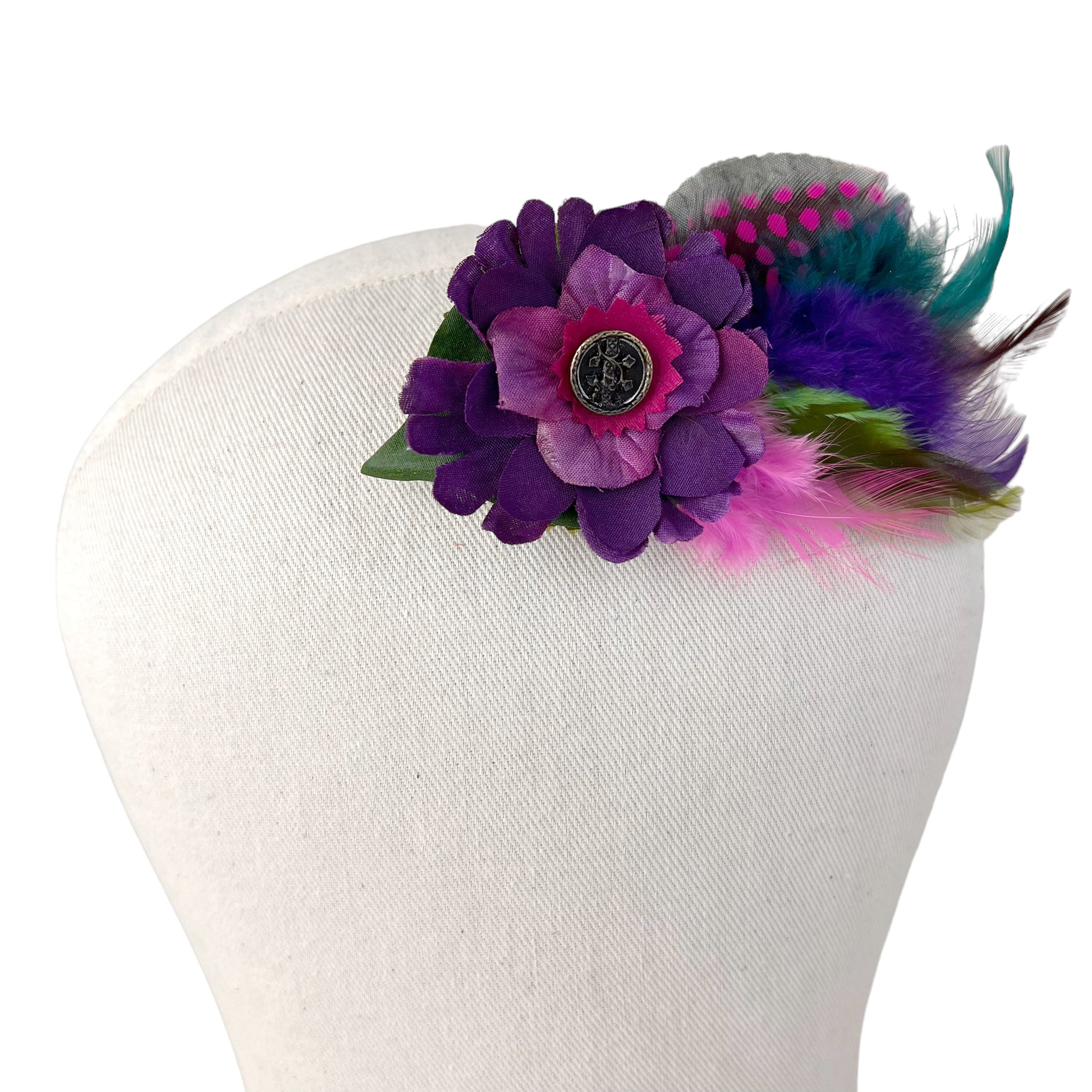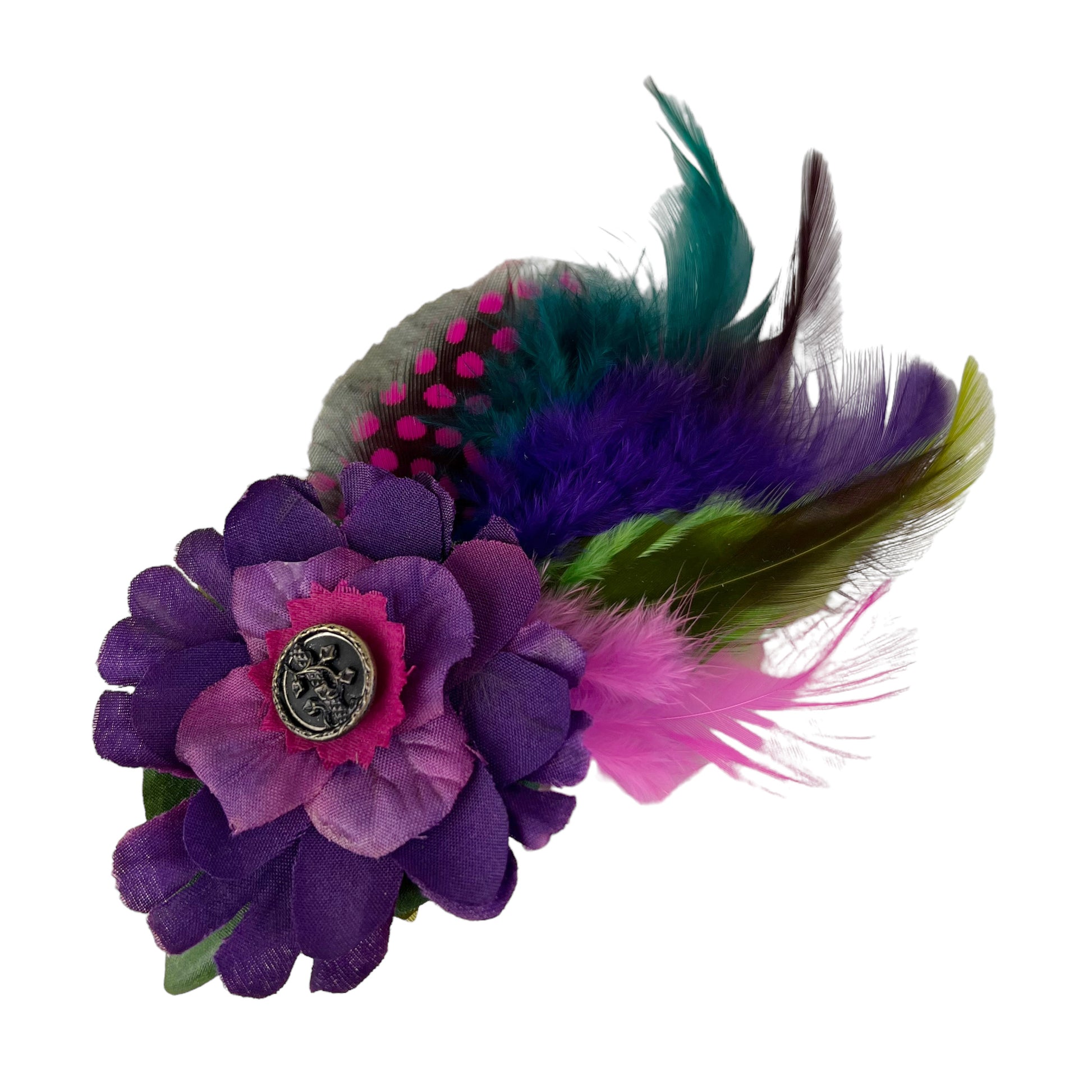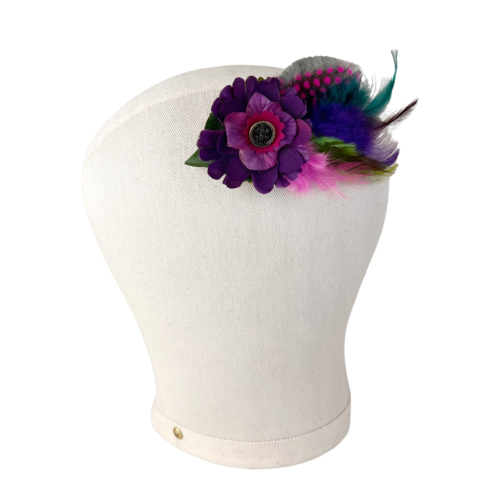 This hand made small pink purple flower feather hair clip is one of a kind. It was designed to compliment an persons outfit color as an hair accent. The antique brass button circa early 1900s, comes from my own treasured button collection.