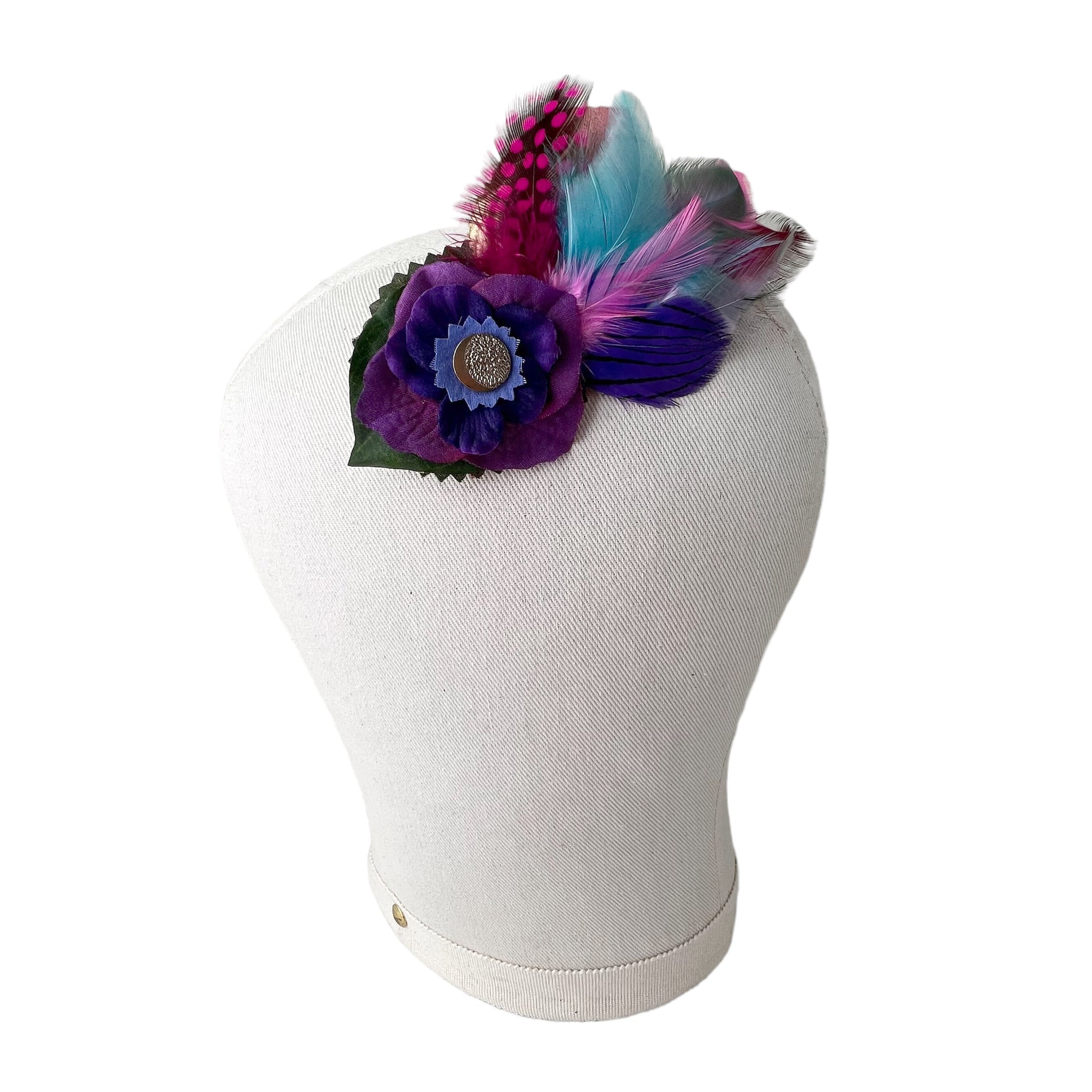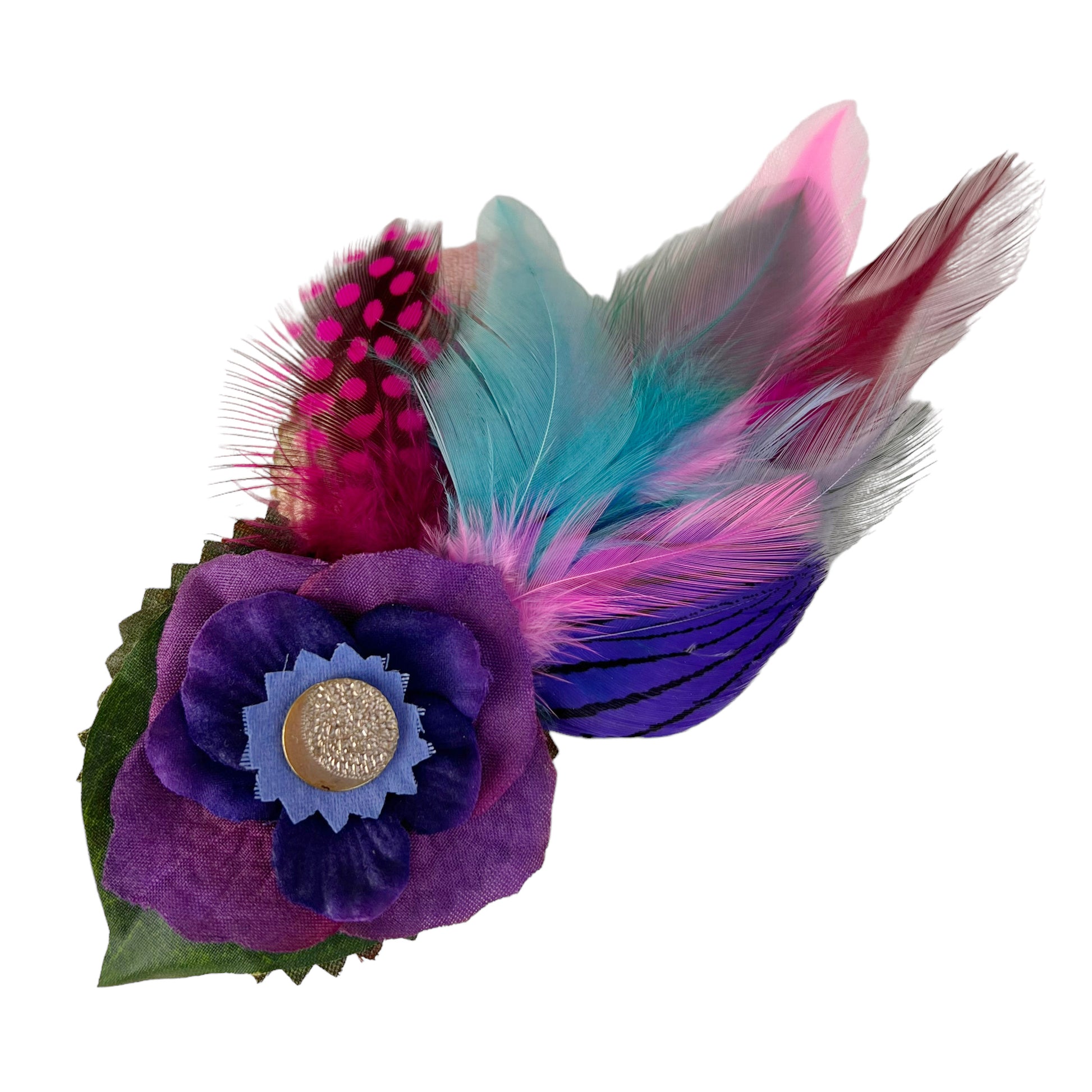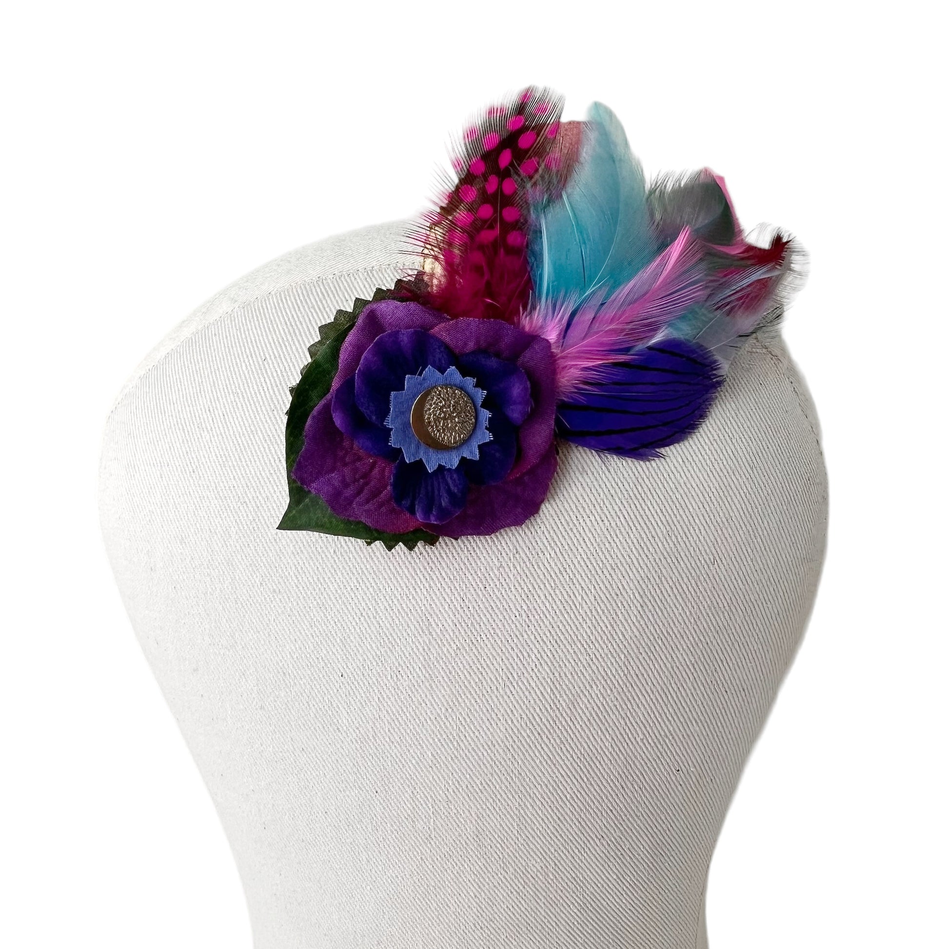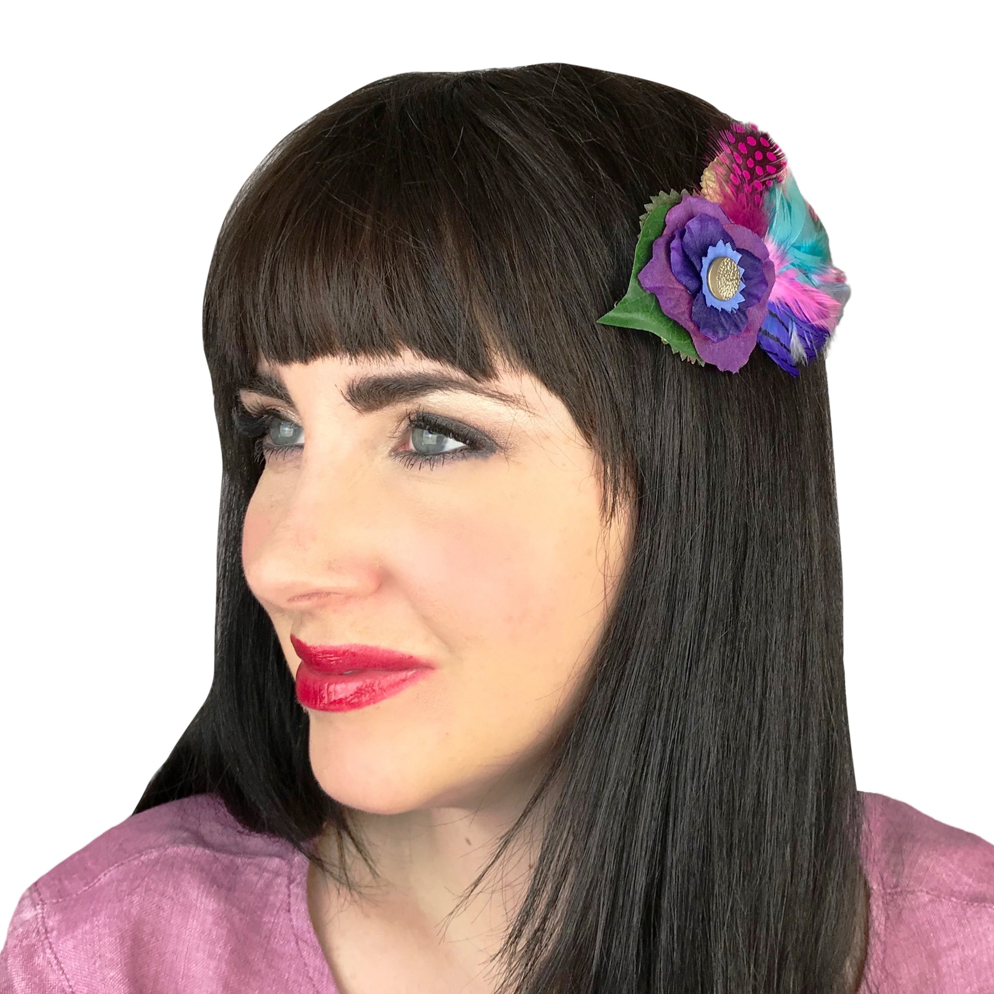 This hand made small purple pink light blue flower feather hair clip is one of a kind. It was designed to compliment an persons outfit color as an hair accent. The antique silver metal crescent moon button circa late 1890s, comes from my own treasured celestial button collection.