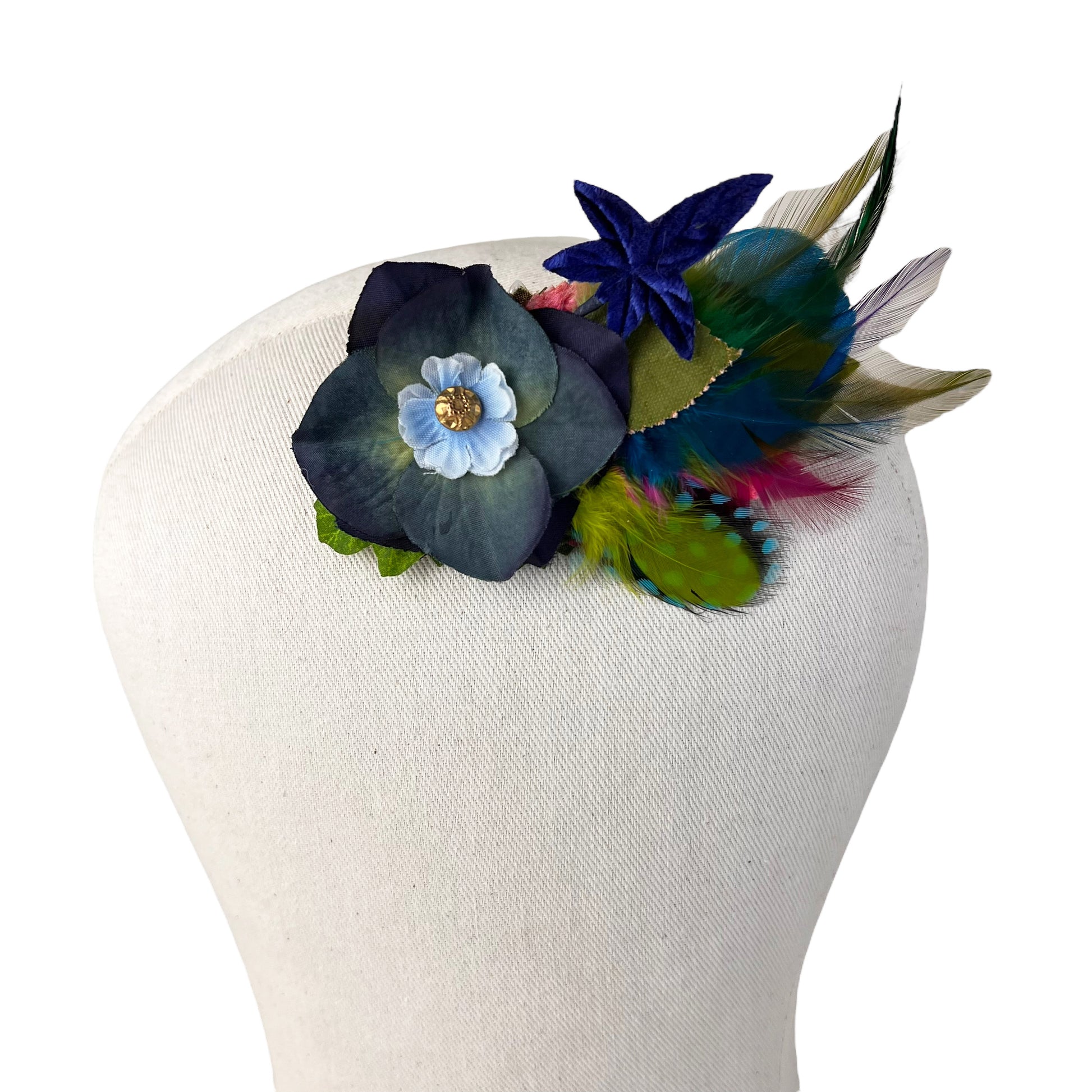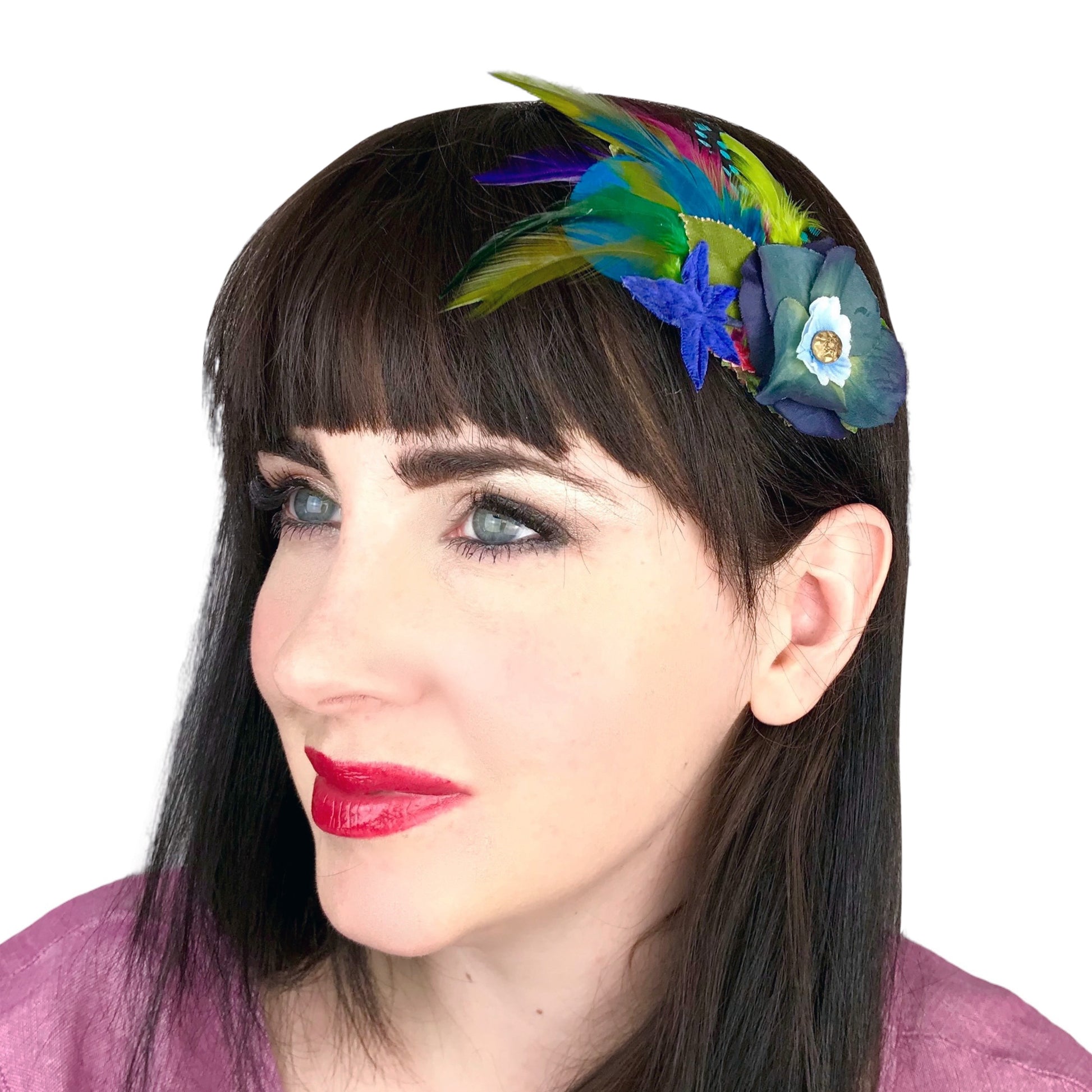 This hand made small blue lime green flower feather hair clip is one of a kind. It was designed to compliment an persons outfit color as an hair accent. The antique brass dolls button circa early 1900s, comes from my own treasured celestial button collection.