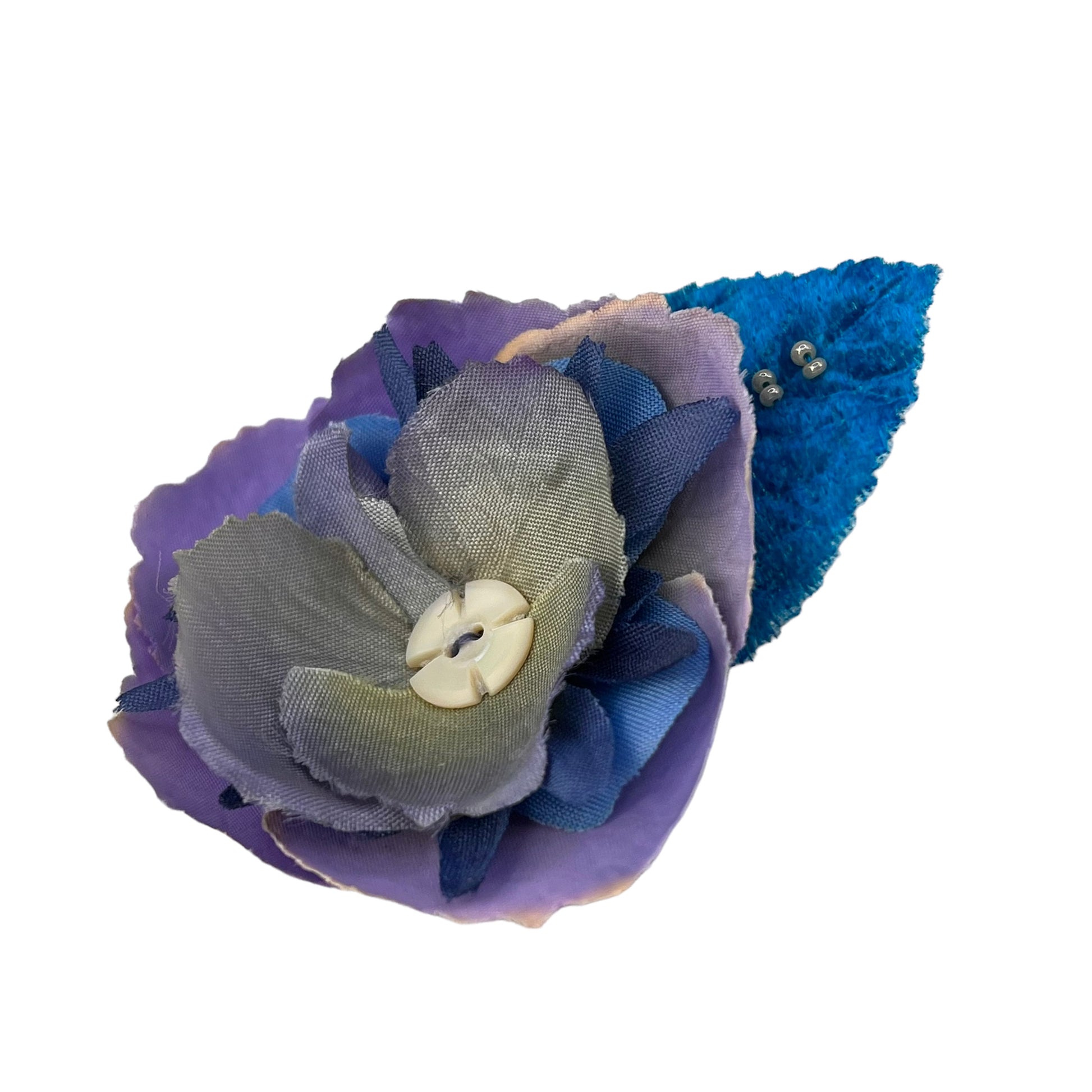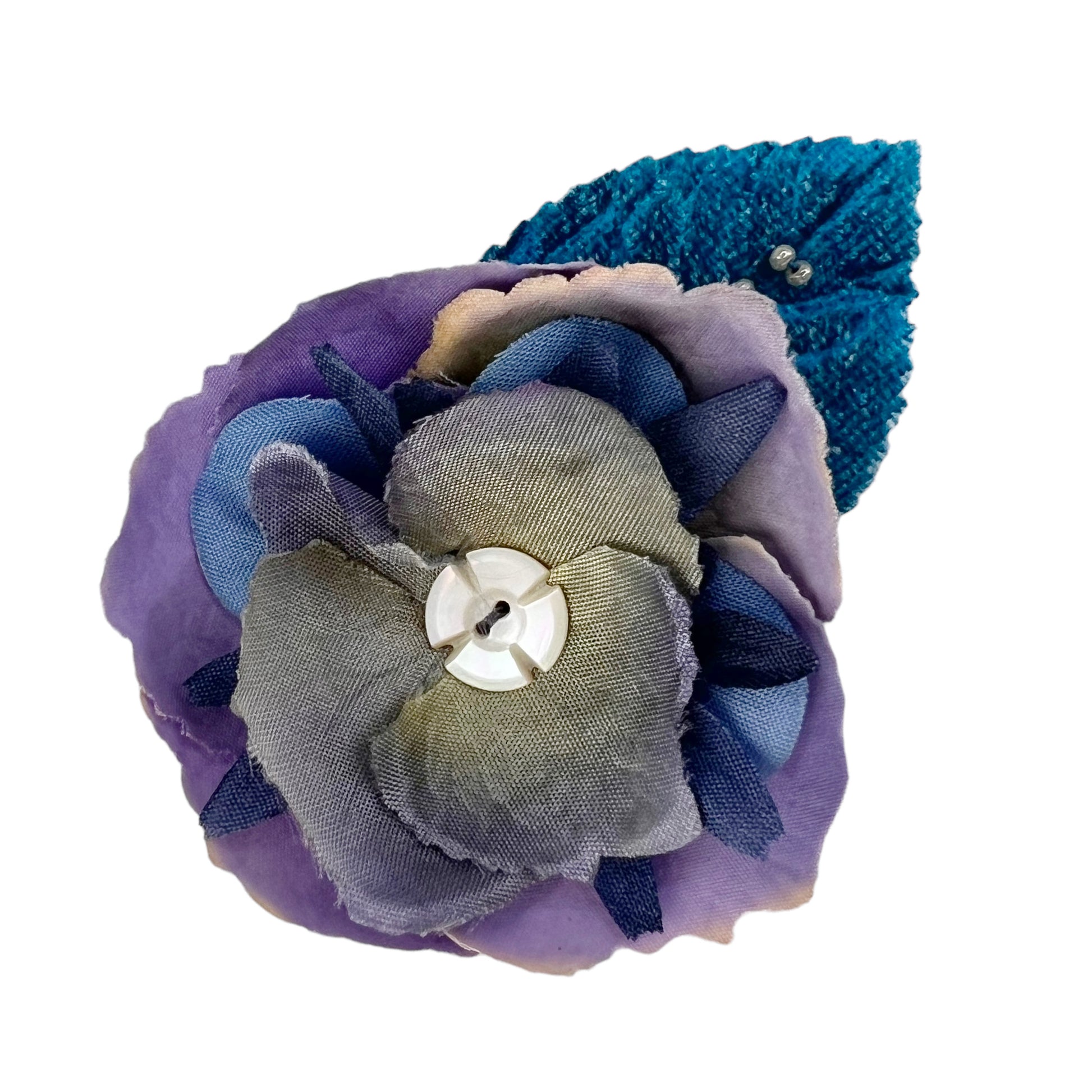 The antique carved mother of pearl button circa early 1890s, comes from my own button collection. A beautiful blue subtle color combination has been created by the layers of petals and the velvet beaded leaf that supports from the back.
