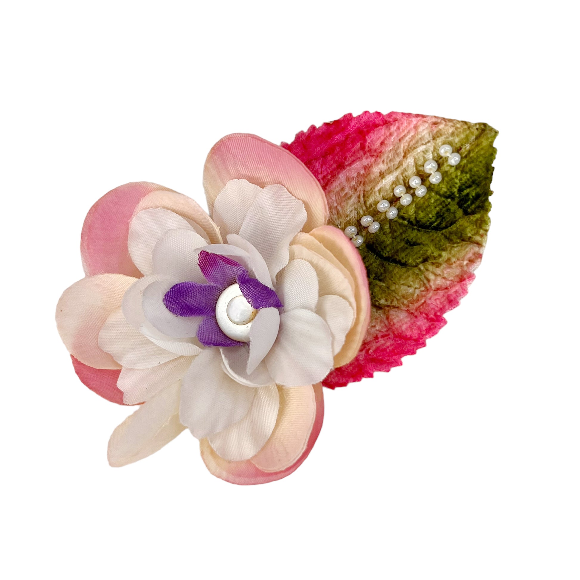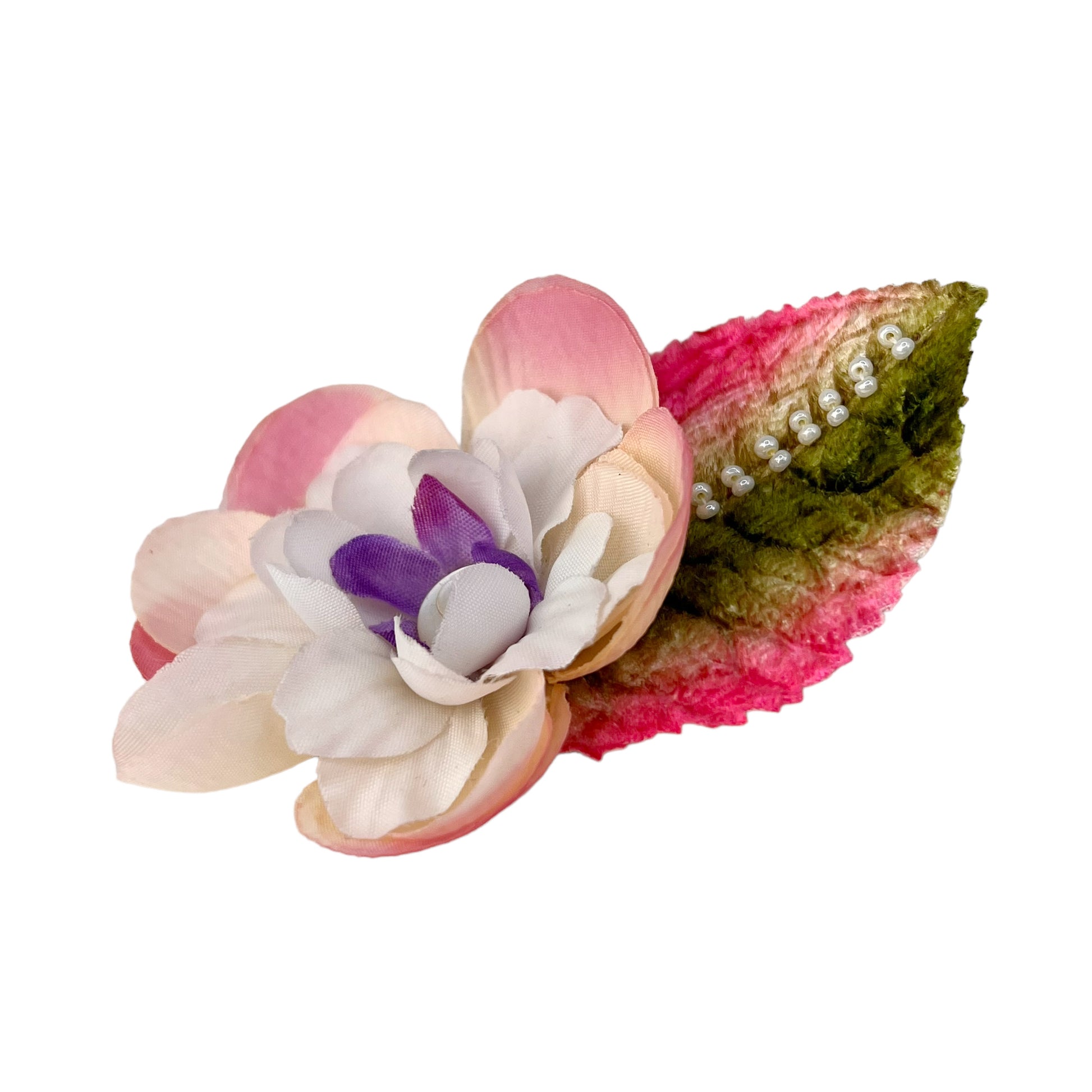 The antique mother of pearl button circa early 1890s, comes from my own button collection. A vibrant pink color combination has been created by the addition of the 3 color velvet beaded leaf and the layers of petals.