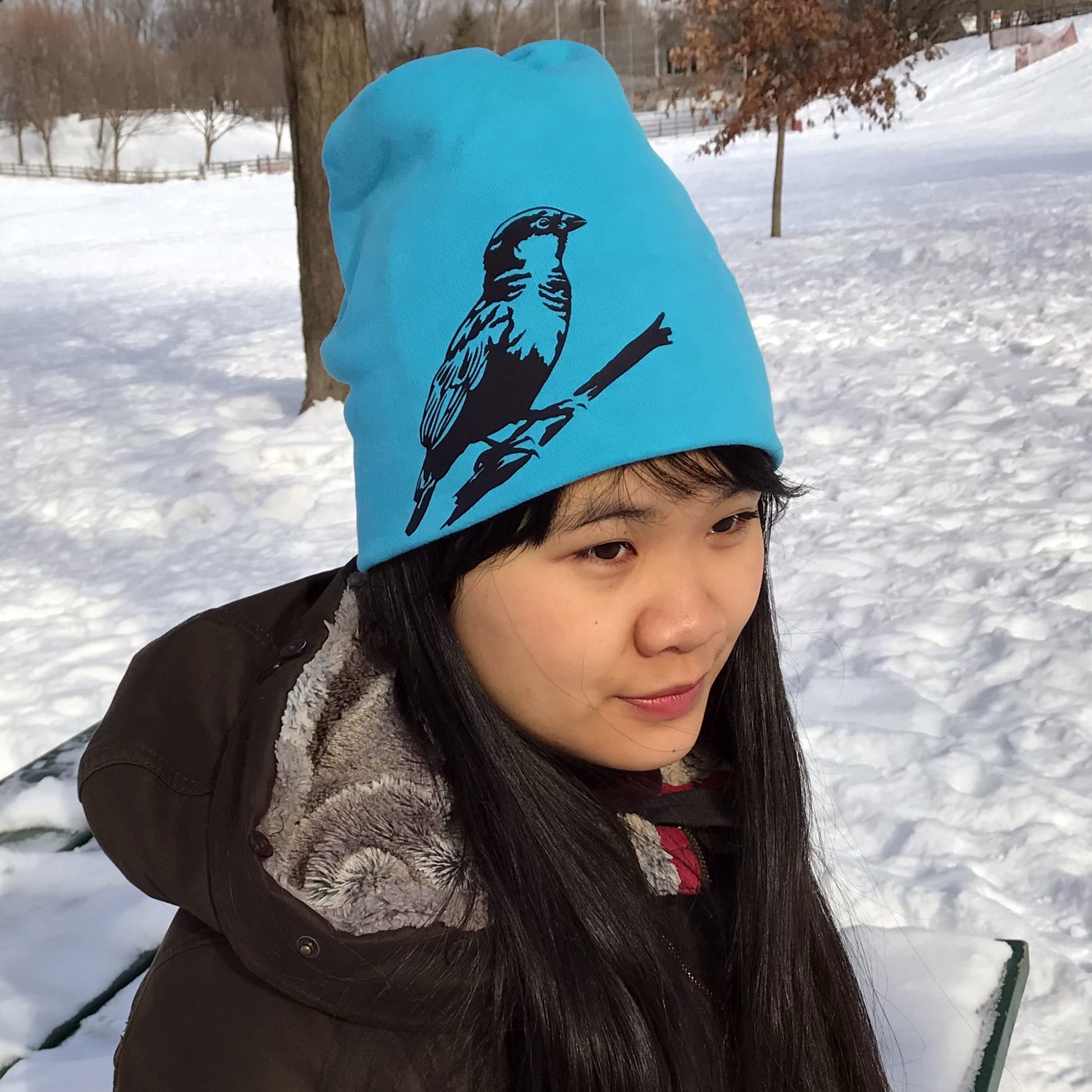 This double layer turquoise blue slouchy toque is made from a 100% cotton brushed fleece fabric. I dye the fabric in small batches of three hats. The Sparrow bird on a branch was created by me and transferred onto the right side of hat.