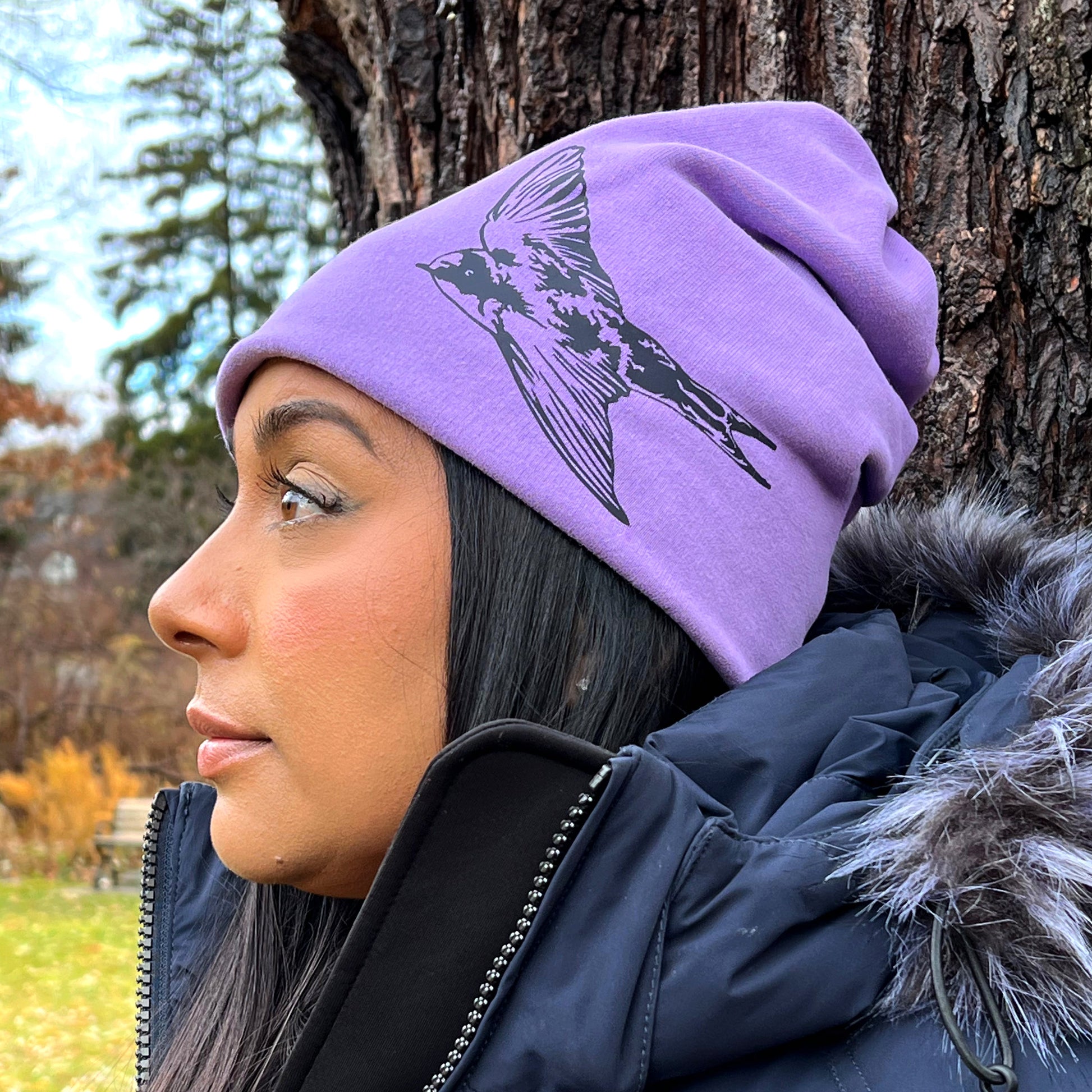 This double layer lilac pink slouchy toque is made from a 100% cotton brushed fleece fabric. I dye the fabric in small batches of three hats. The flying swallowtail in the air was created by me and transferred onto the right side of hat.