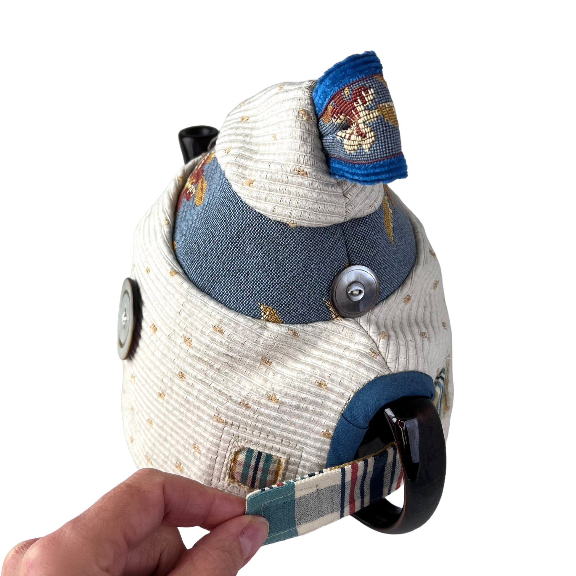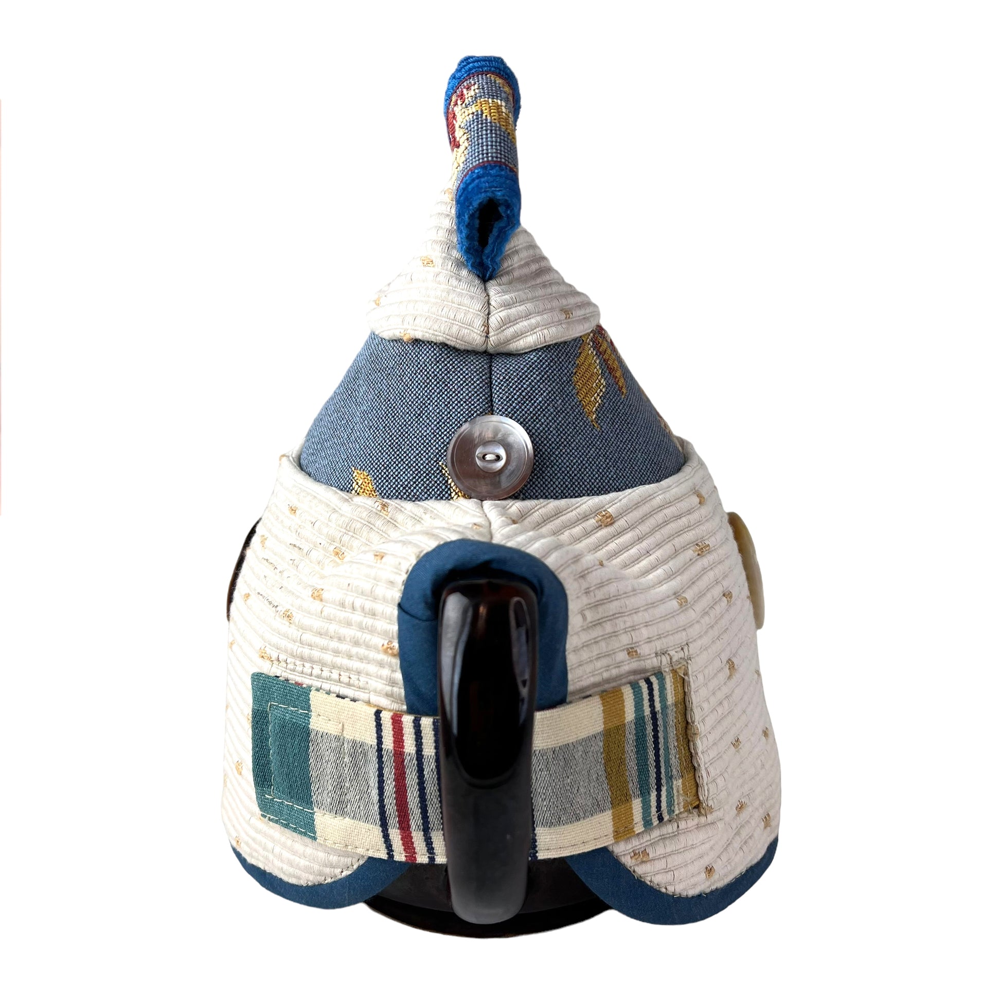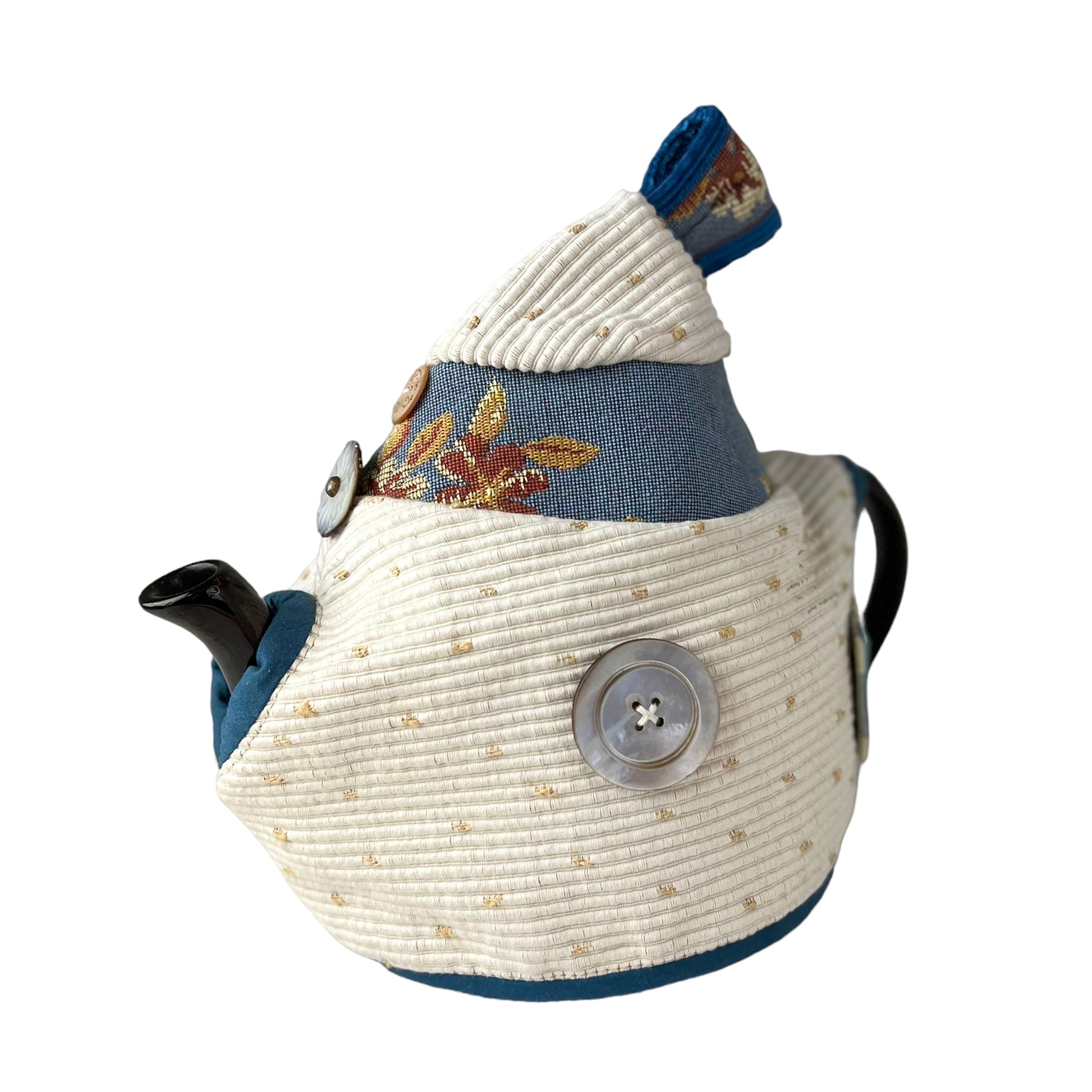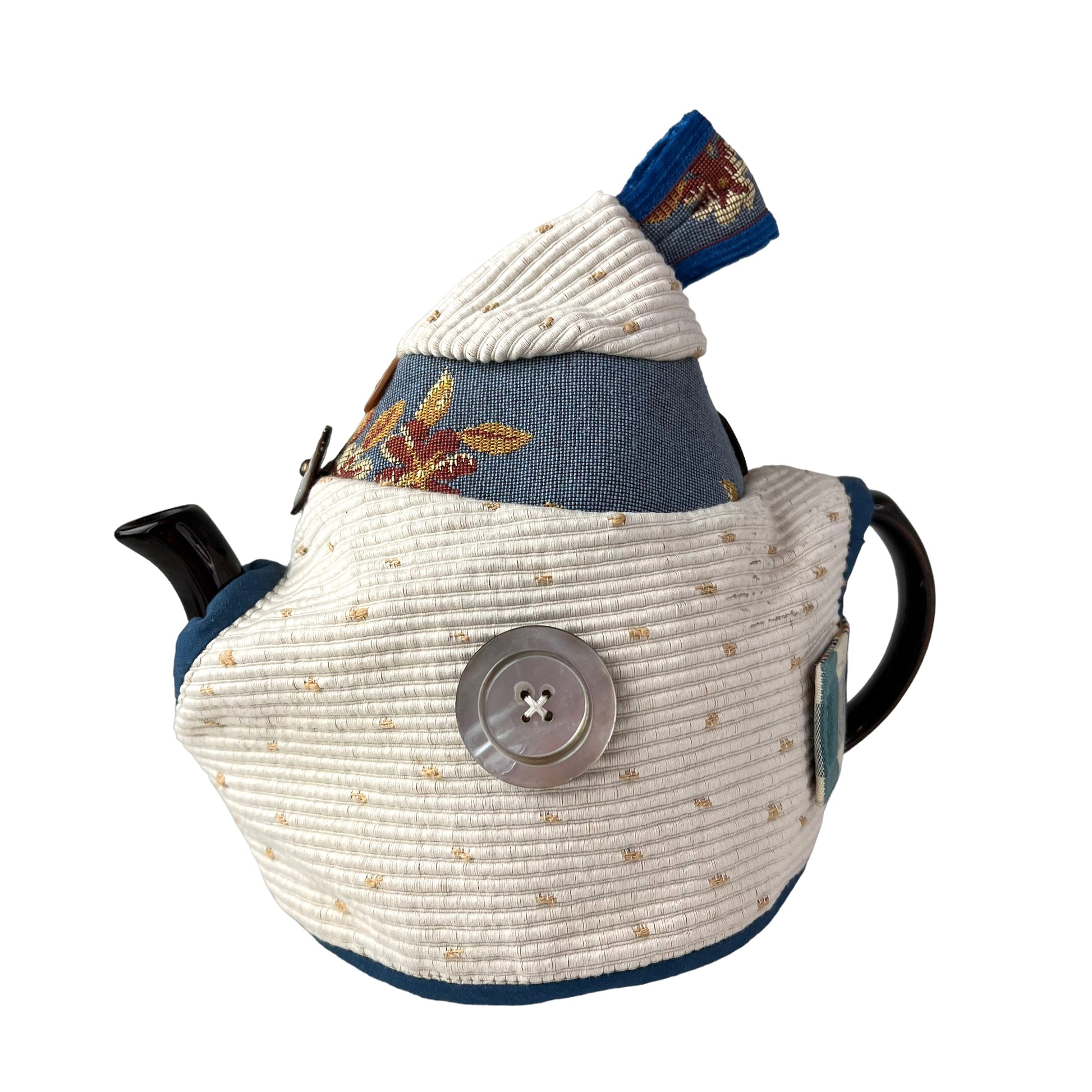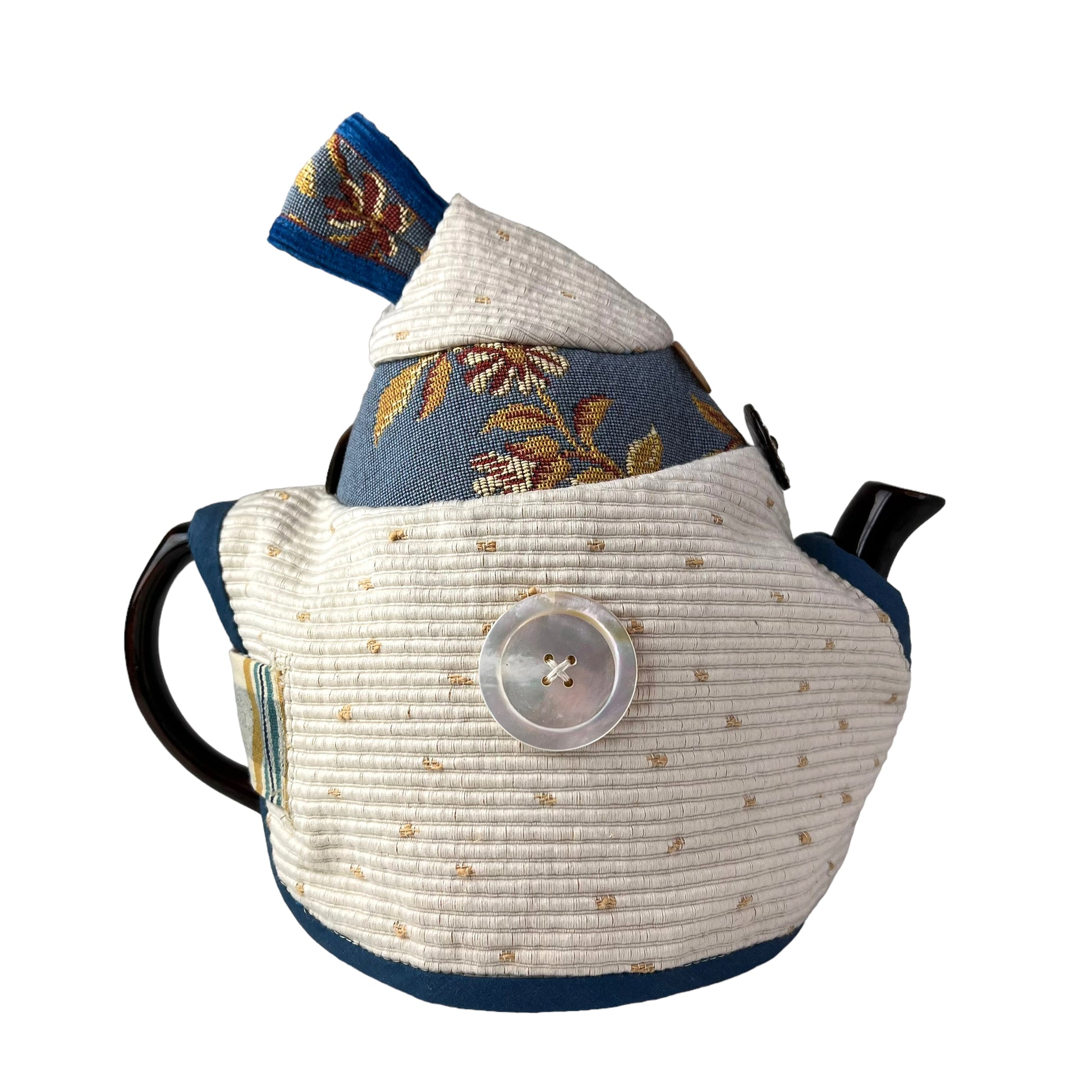 This is no ordinary white tapestry Tea cozy.  I designed it to be long lasting with the most beautiful materials and notions.  Antique buttons and a magnetic closure makes this design a Art form on ones' breakfast table. Designed for the classic 4 cup Brown Betty teapot it is easy to slide on and off. Once its filled with your steeping tea you can keep it on while you pour.