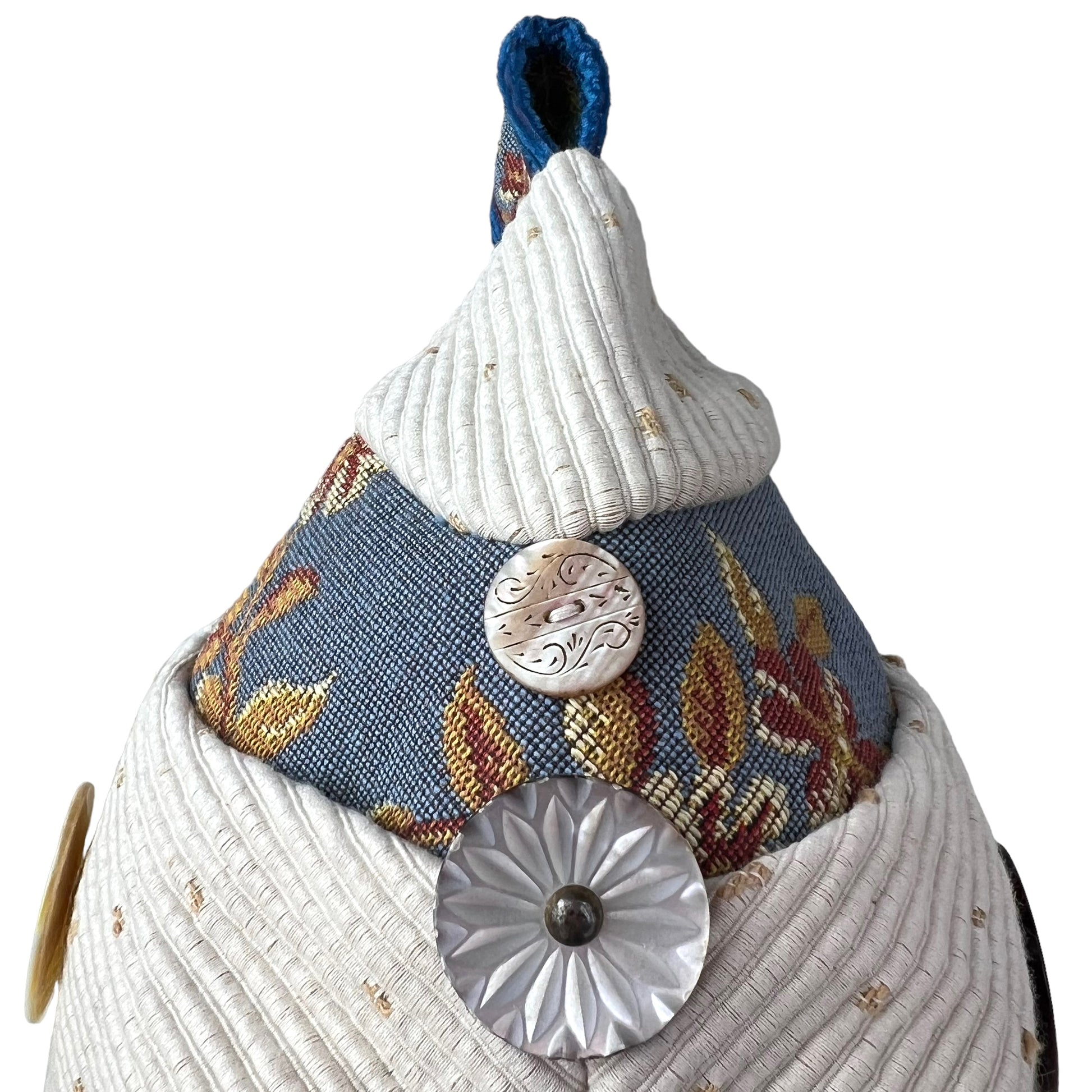 I chose this fresh palette of white and blue tapestry to compliment the antique carved buttons of the 1800s.