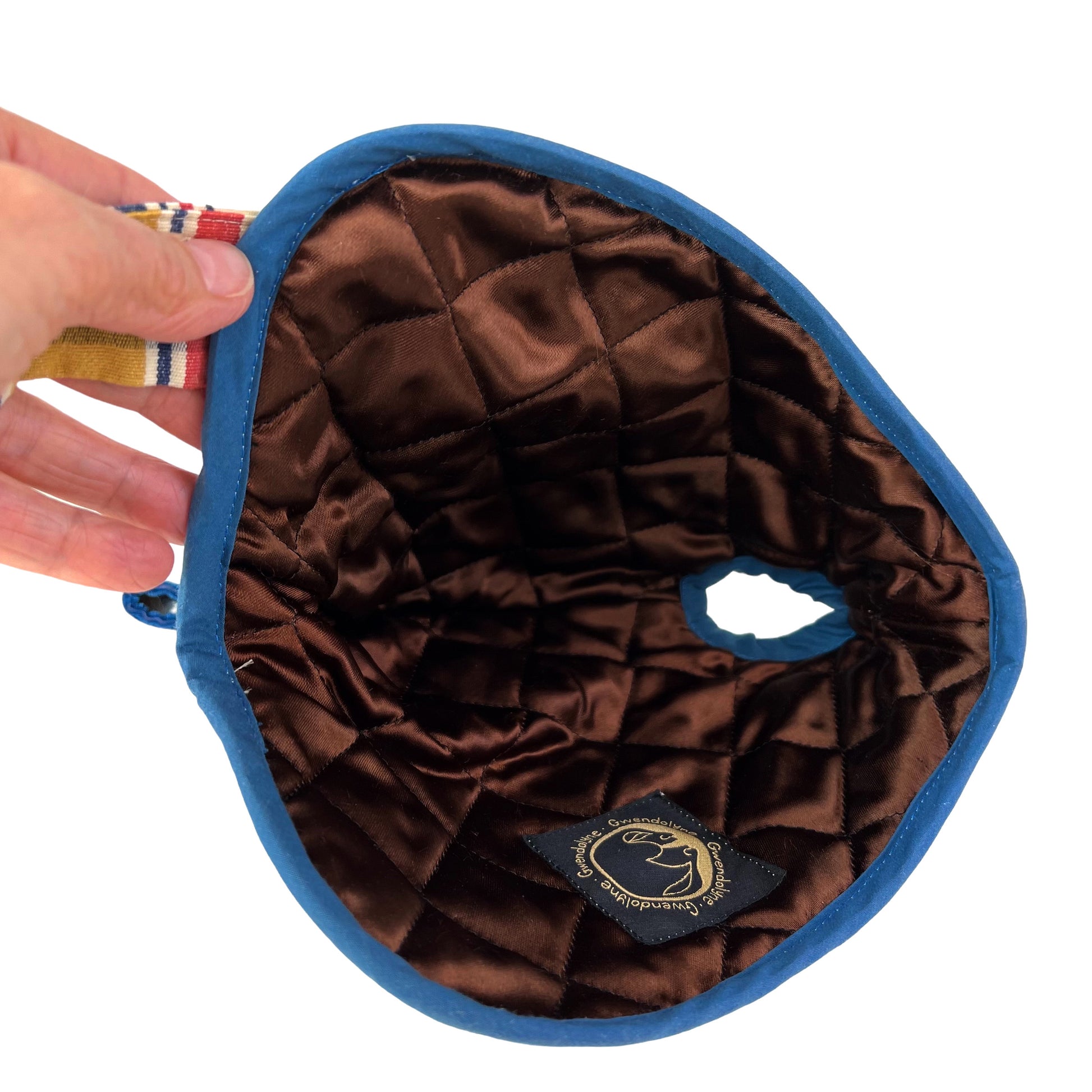 This tea cozy is lined with a olive quilted satin that has a poly interior to add more heat insulation for the tea inside.