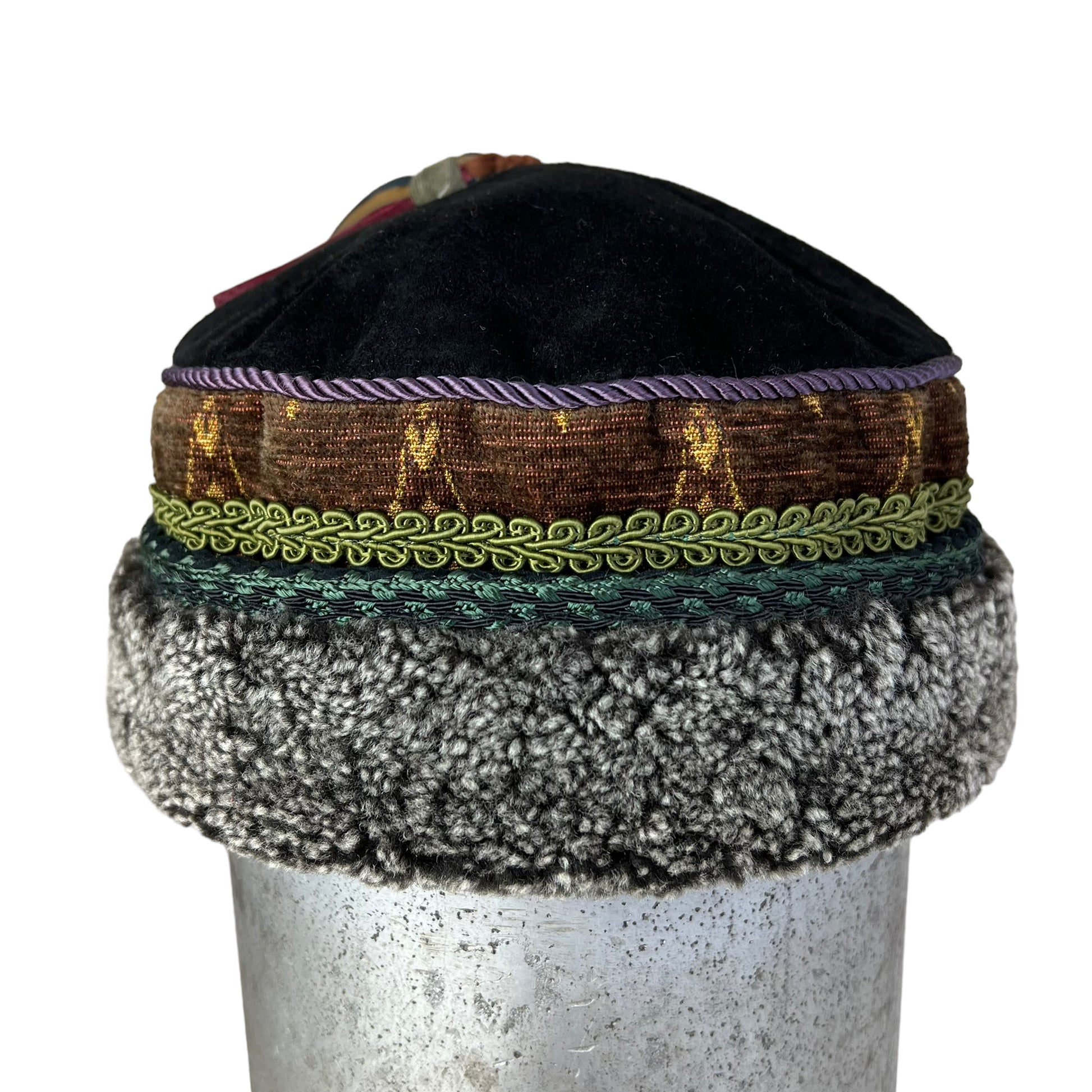 The top is constructed with pig-suede, with a hand cut and made lamb skin tassel. The band is cut with a Belgium tapestry and the rim from a luxurious show-top merino lamb fur from Spain. The lining is a preshrunk black 100% cotton flannel.
