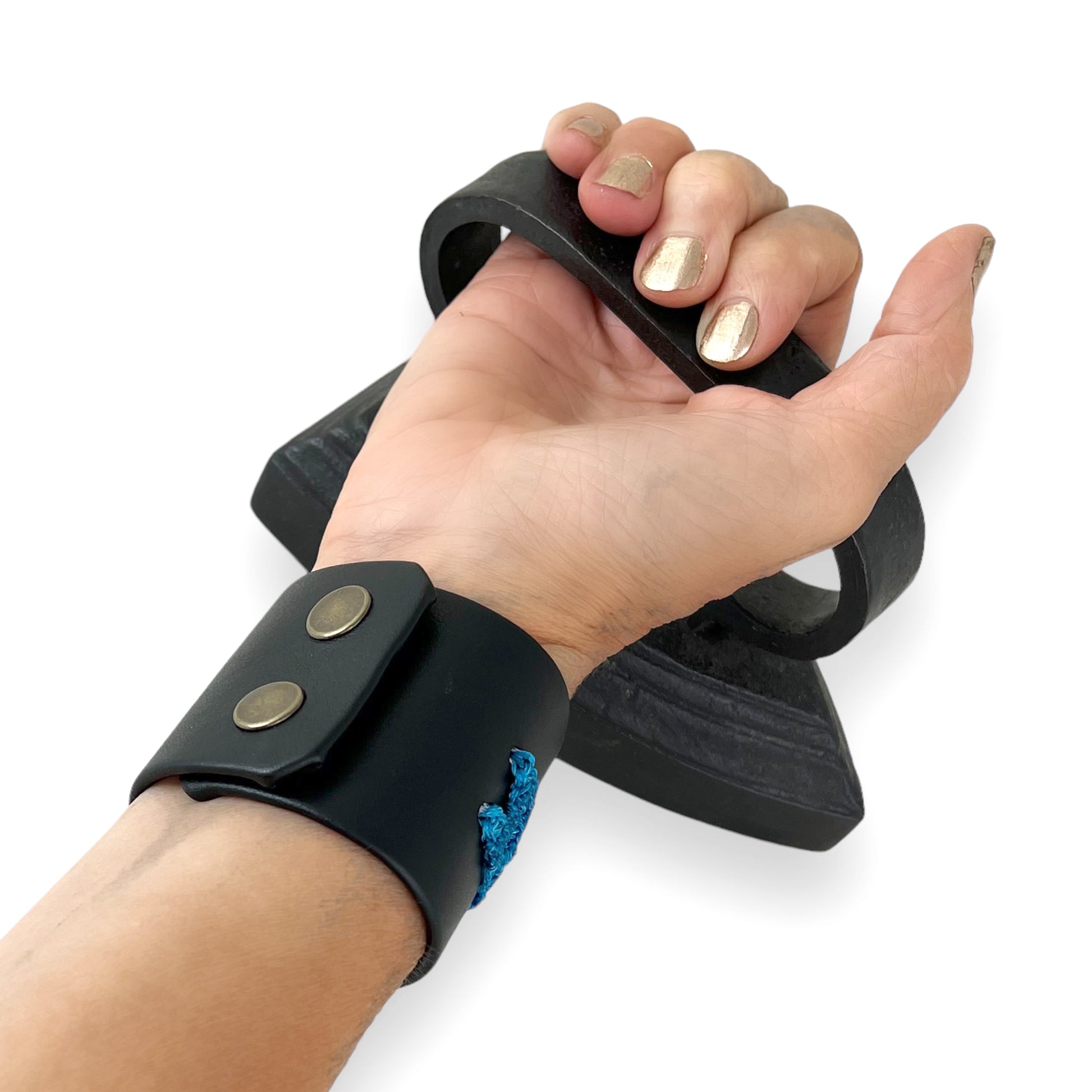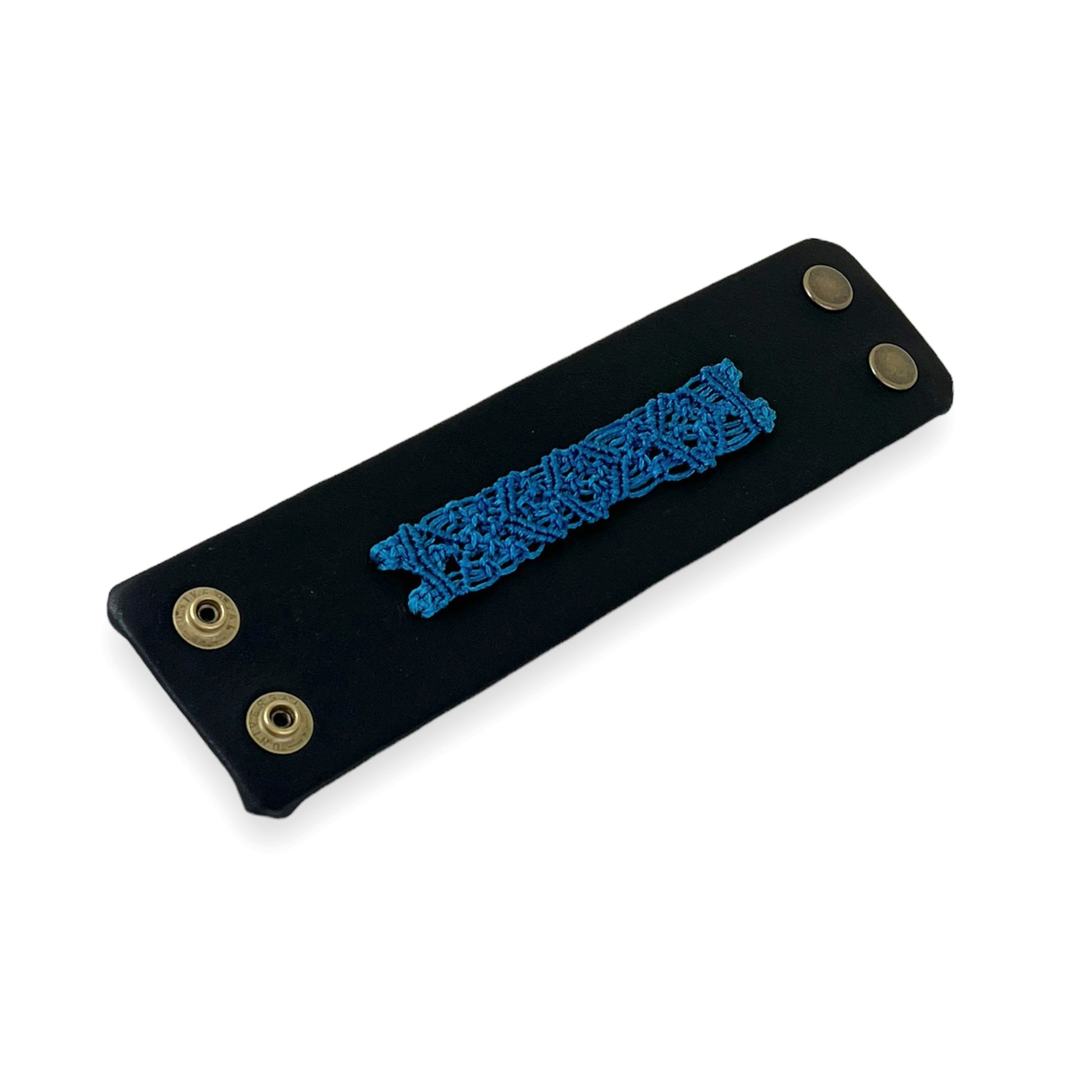 My process begins with creating a unique hand macrame work from waxed linen. Once completed I mount this work on a durable infrastructure that is covered on the top and bottom with cowhide leather. The cuff is 2 inches wide.