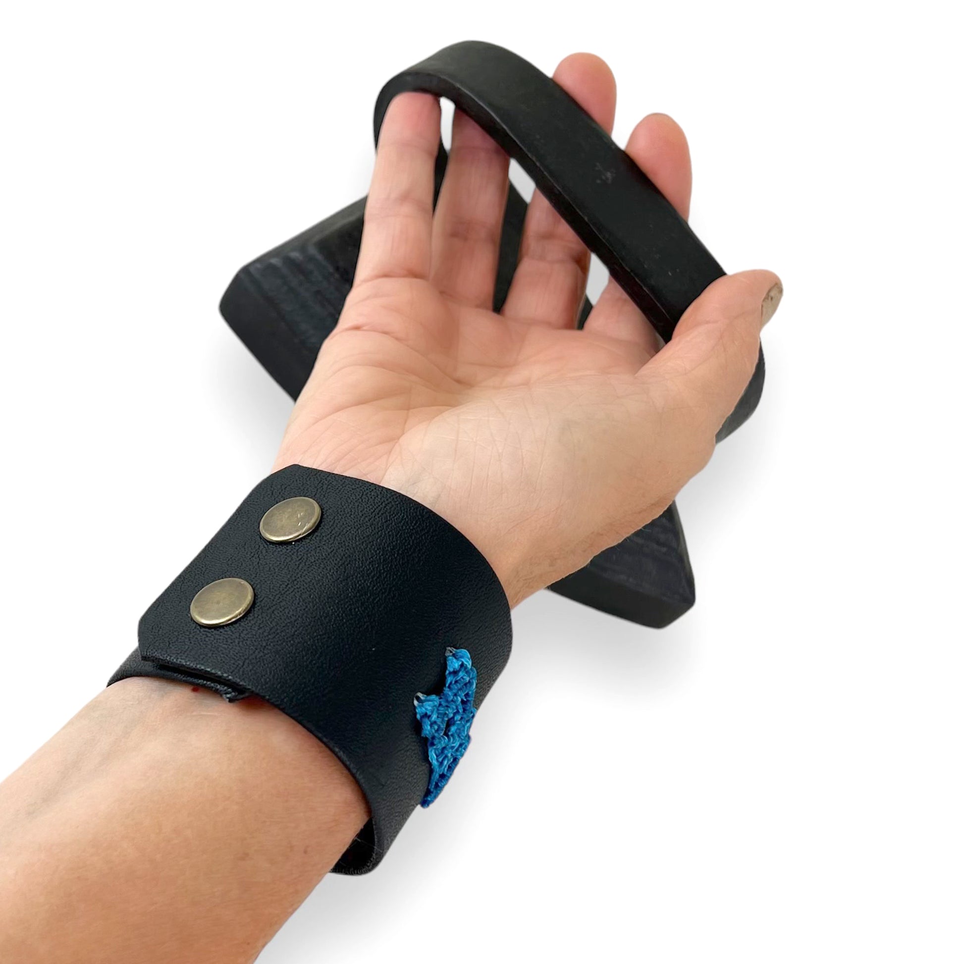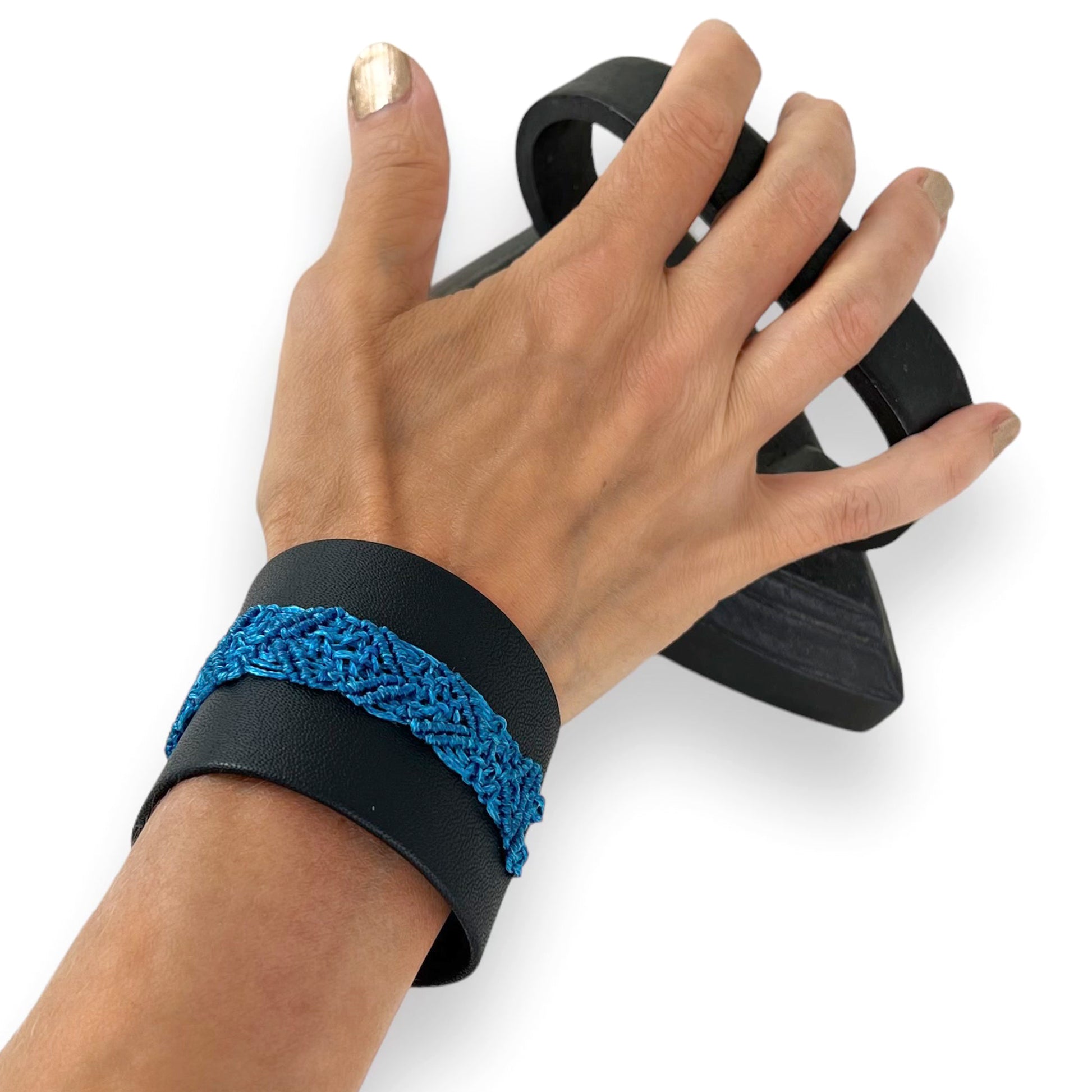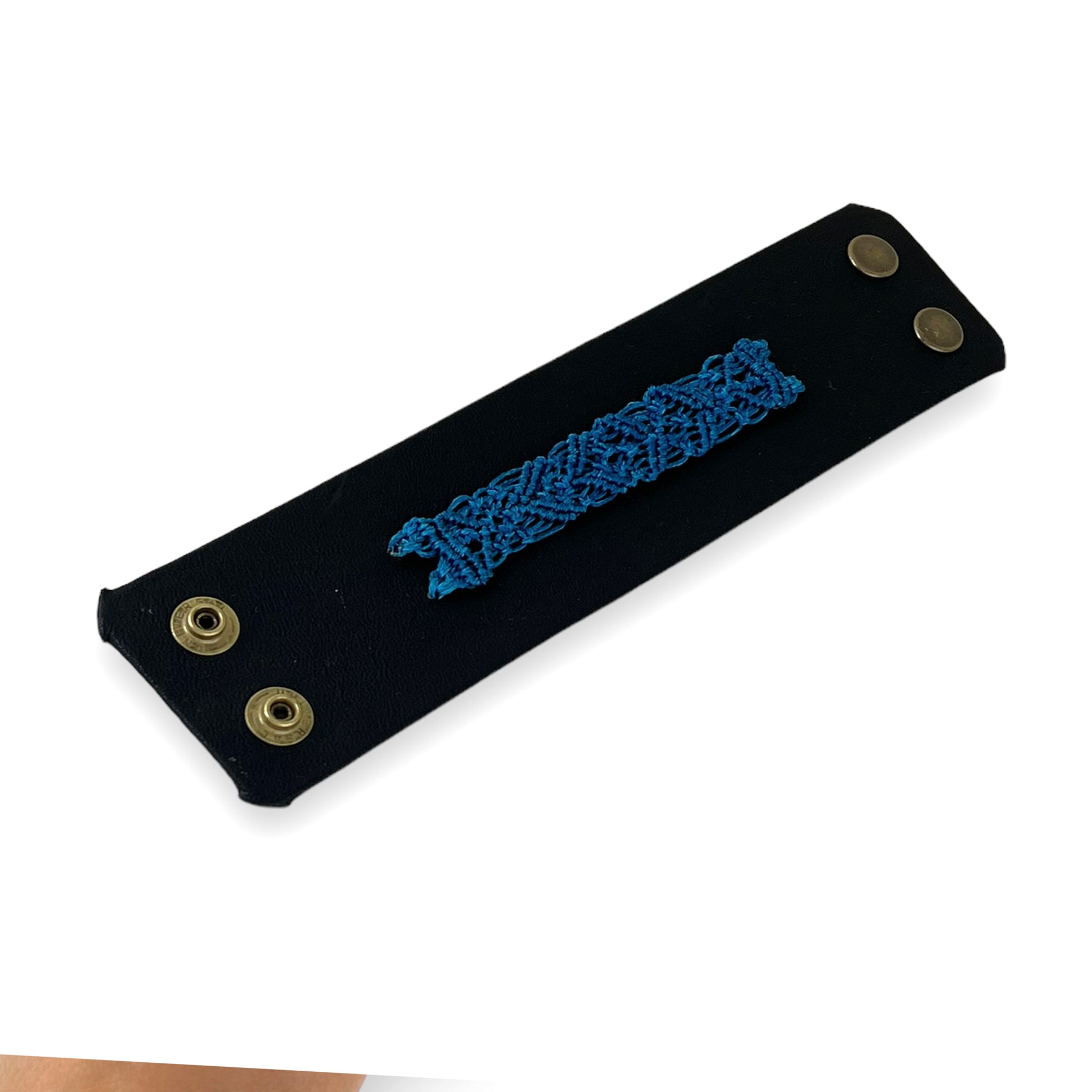 My process begins with creating a unique hand macrame work from waxed linen. Once completed I mount this work on a durable infrastructure that is covered on the top and bottom with cowhide leather. The cuff is 2 inches wide.