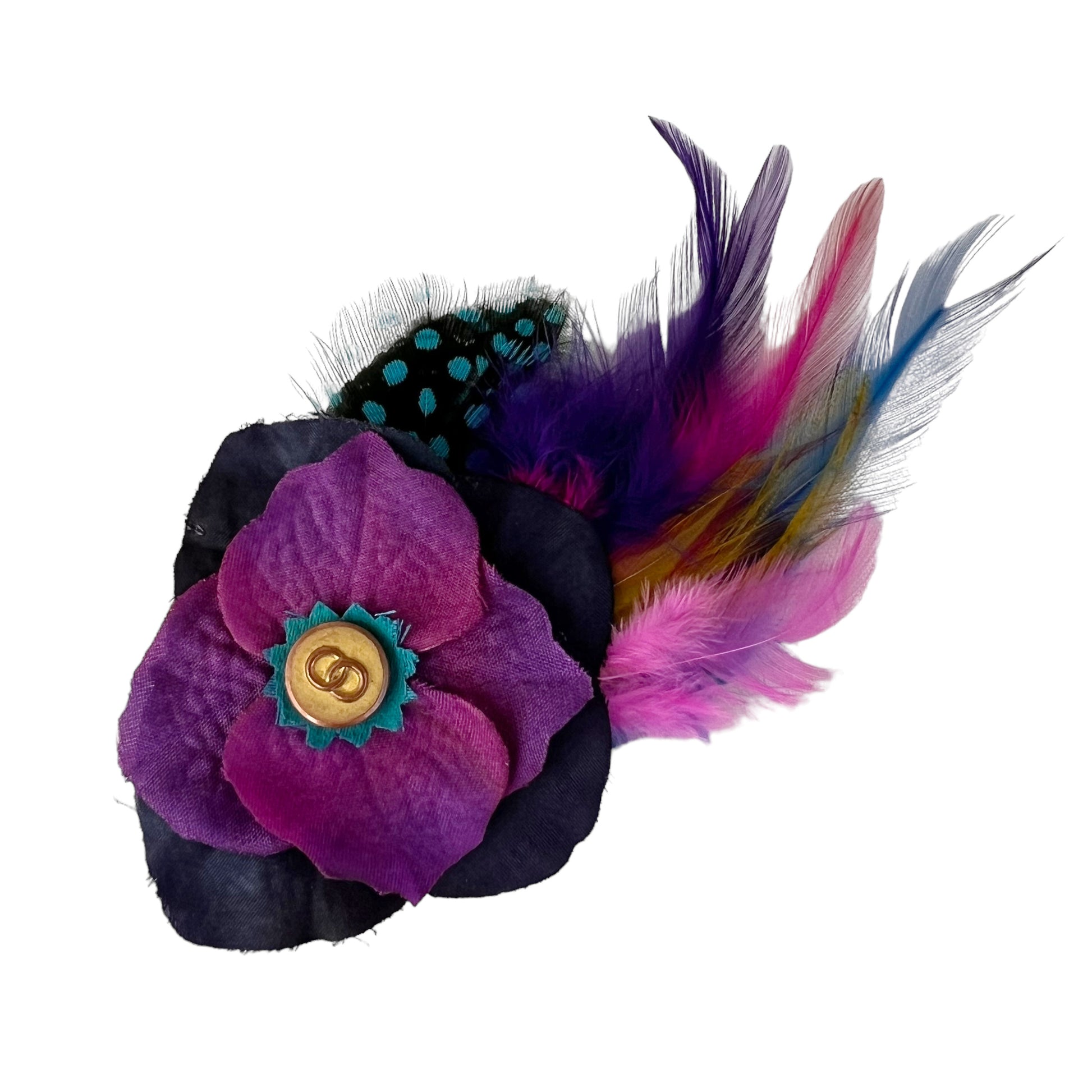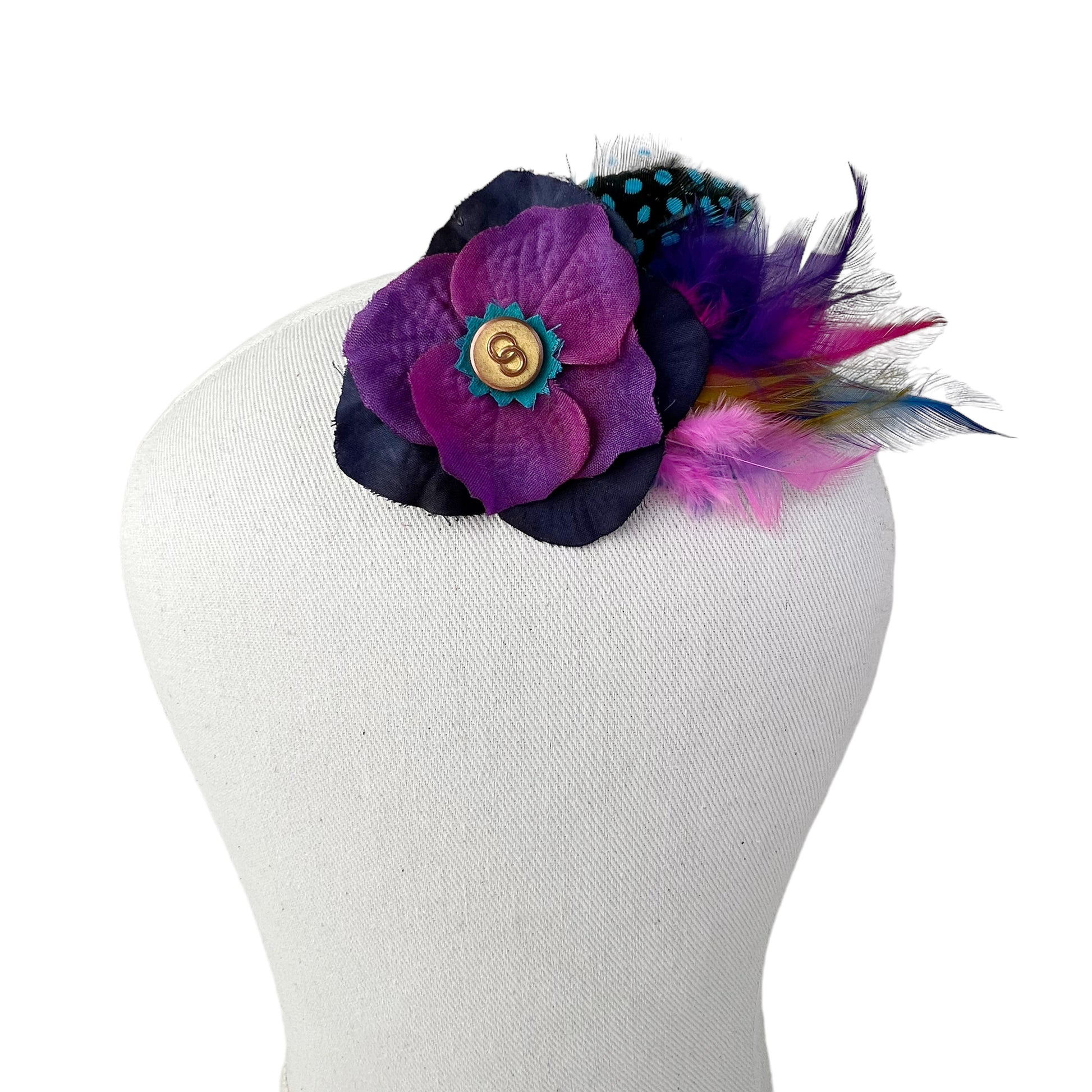 This hand made small violet pink blue flower feather hair clip is one of a kind. It was designed to compliment an persons outfit color as an hair accent. The antique brass button circa early 1900s, comes from my own treasured button collection.
