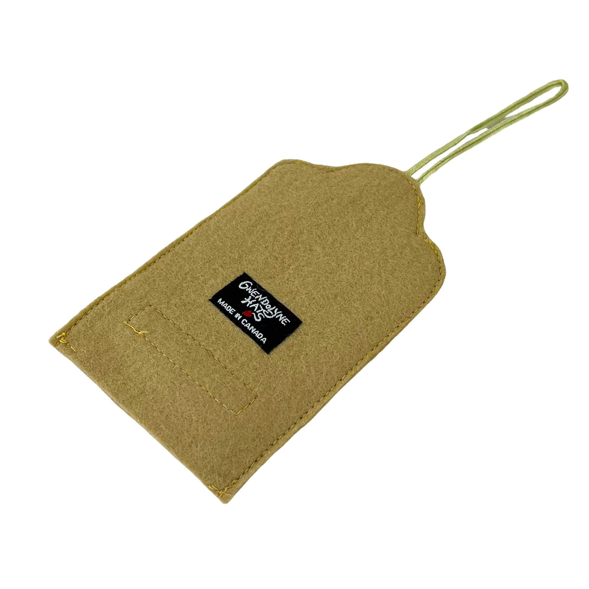 This wheat frame is made from a sturdy 100% wool felt that is sewn and decorated with a vintage orange floral button from the 1950s. The laminated card  is the template (2  7/16" wide by 3  10/16") for you to use for trimming the photo is so wish to insert inside. The bottom openings have a Velcro closure to open and close.