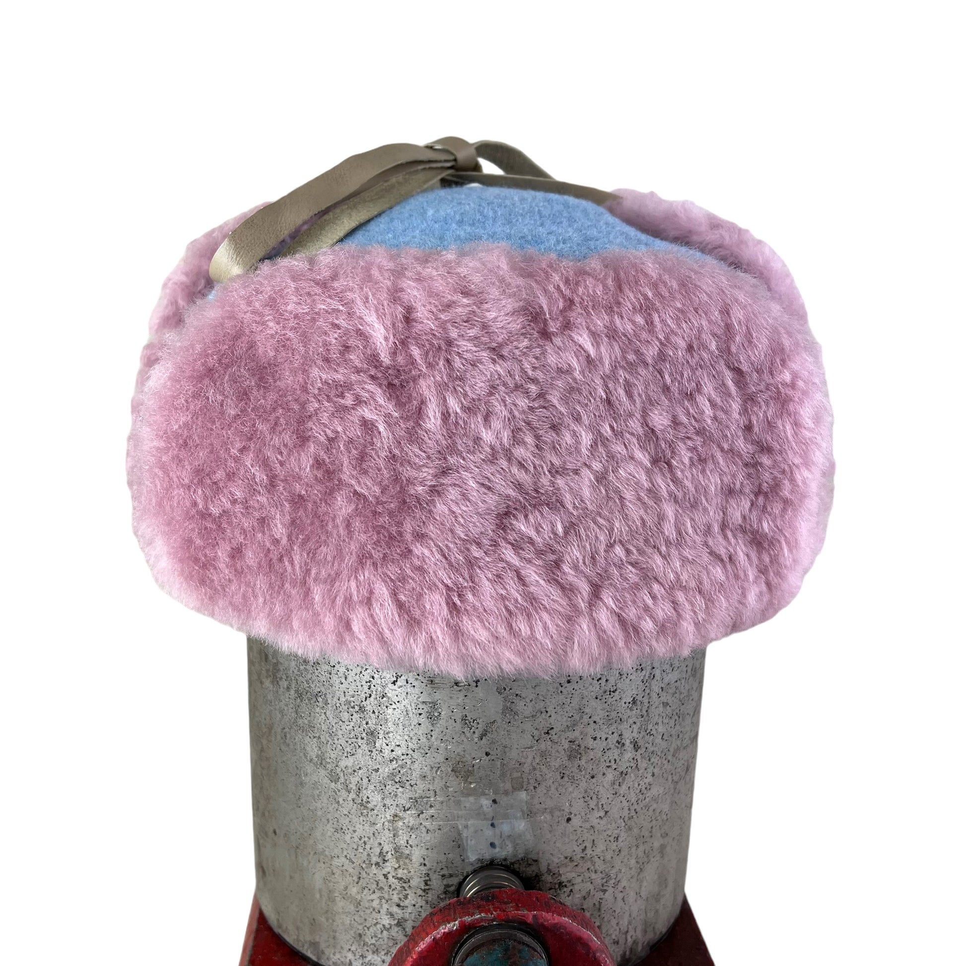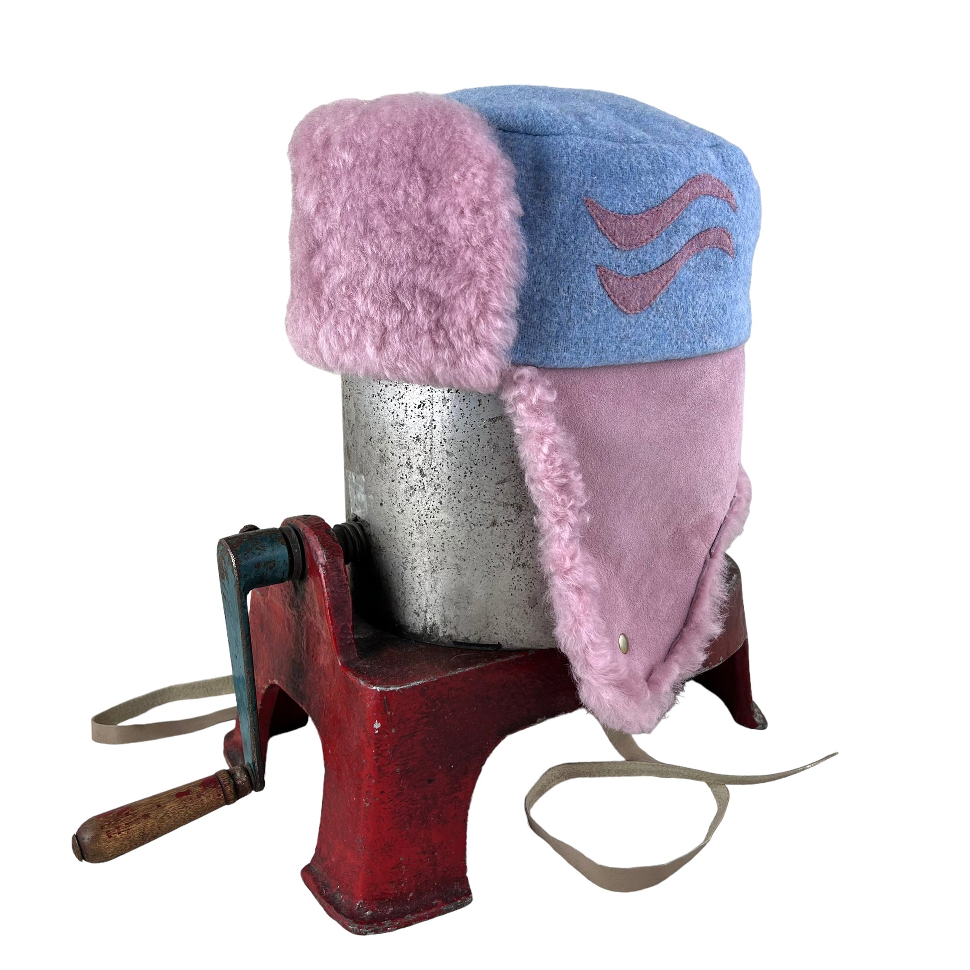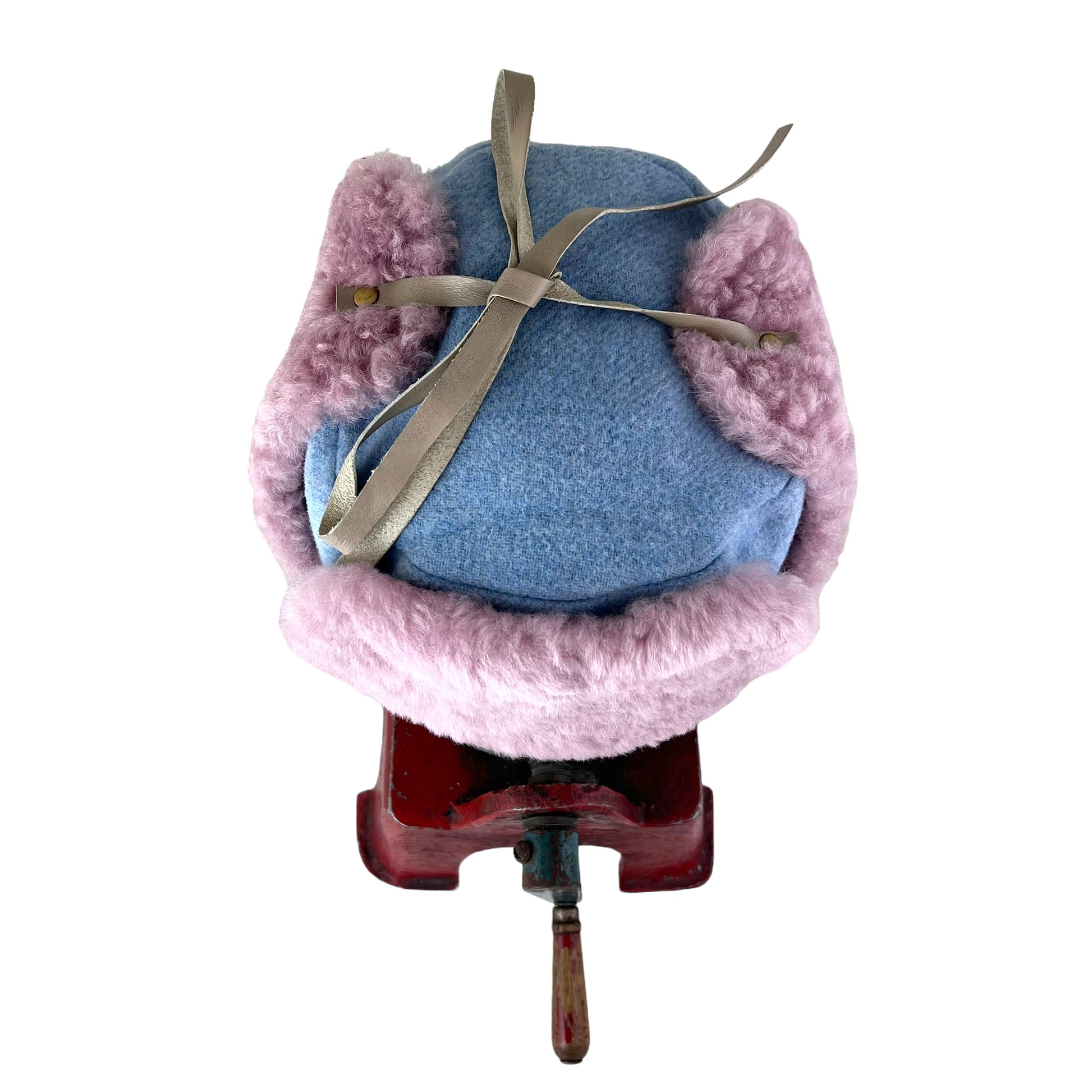 This Winter Wave design is for the coldest of days of weather. The hat is made from a double face baby blue wool fabric and is lined with soft cotton flannel fabric.  There are pink wool sewn appliques on each side. The pink Icelandic fur shearling used in this helmet hat is finished with a soft blue color. The  straps are made from thin cowhide leather.