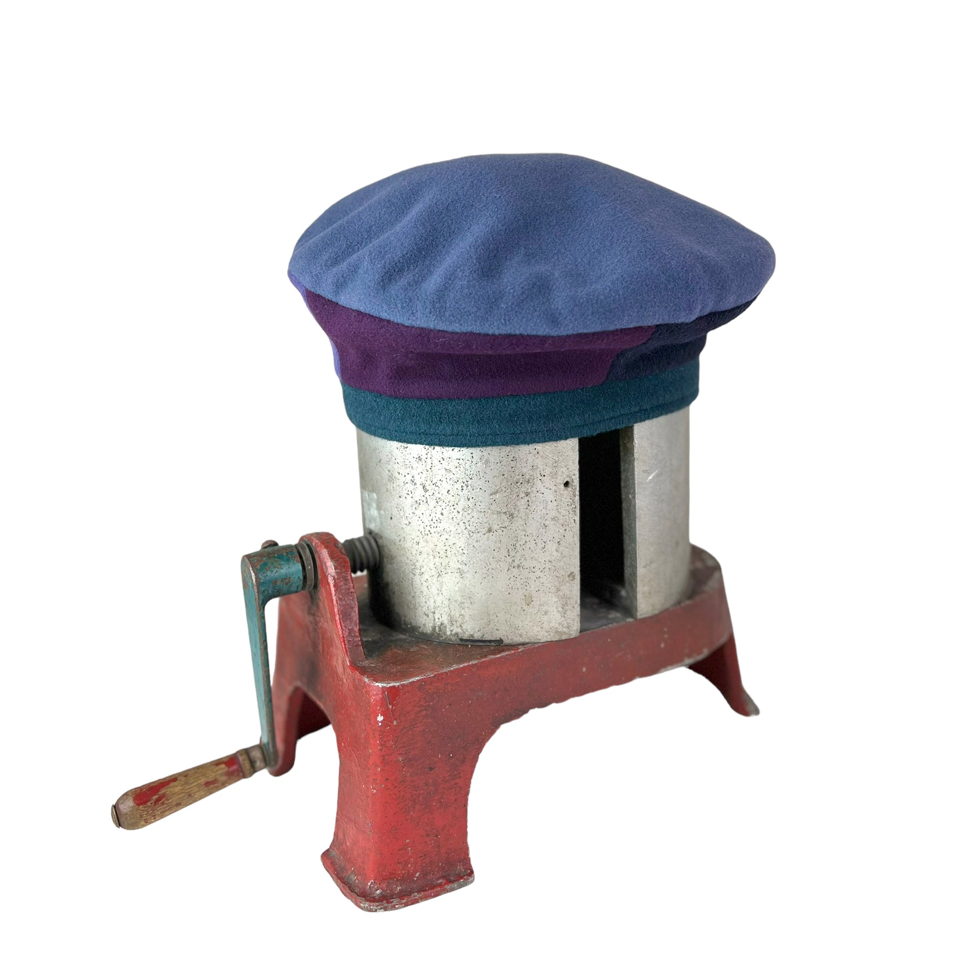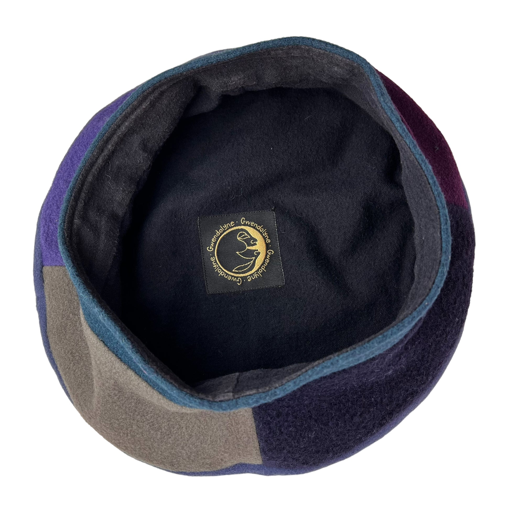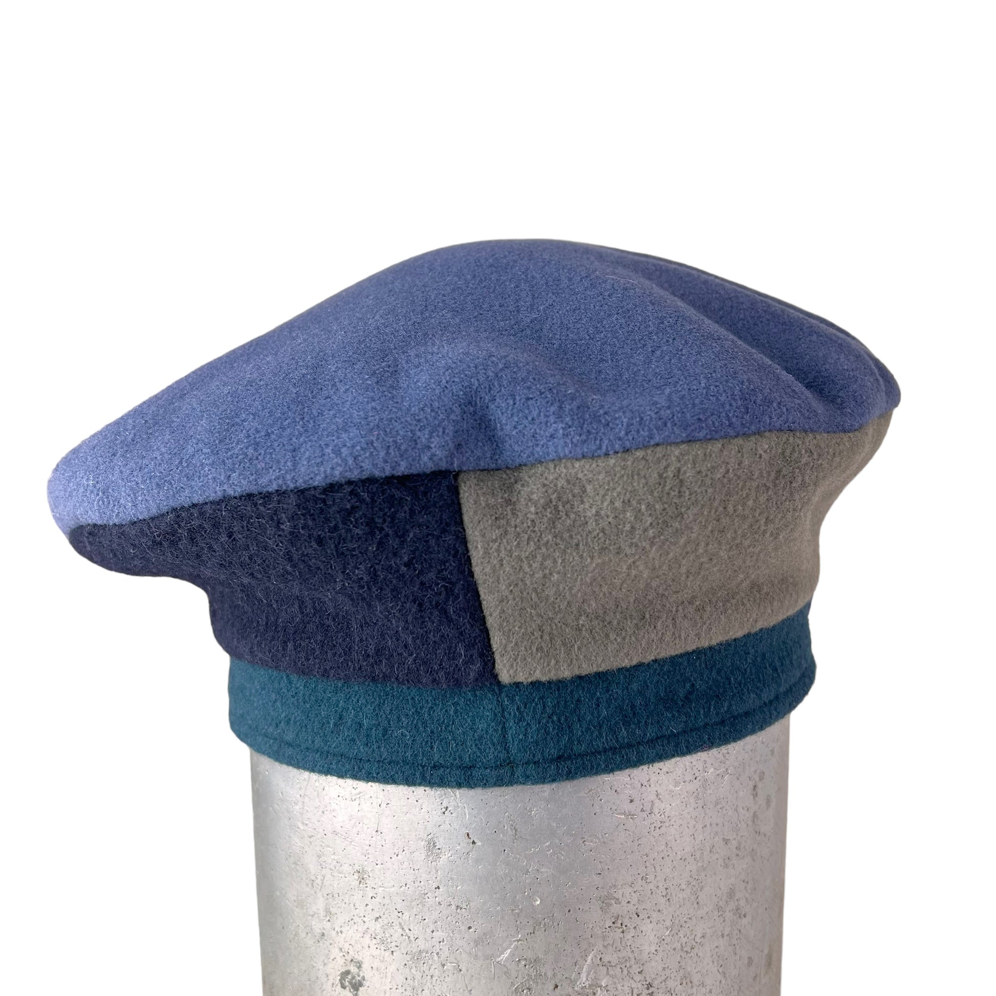 Looking for a stylish winter light blue beret styling hat? This unique beret tam style hat is one of a kind. It is hand cut and sewn together using six colors of cashmere blend wool for the outer layer.  The wool rim band is embellished with 3 sewn vintage 50’s plastic buttons.
