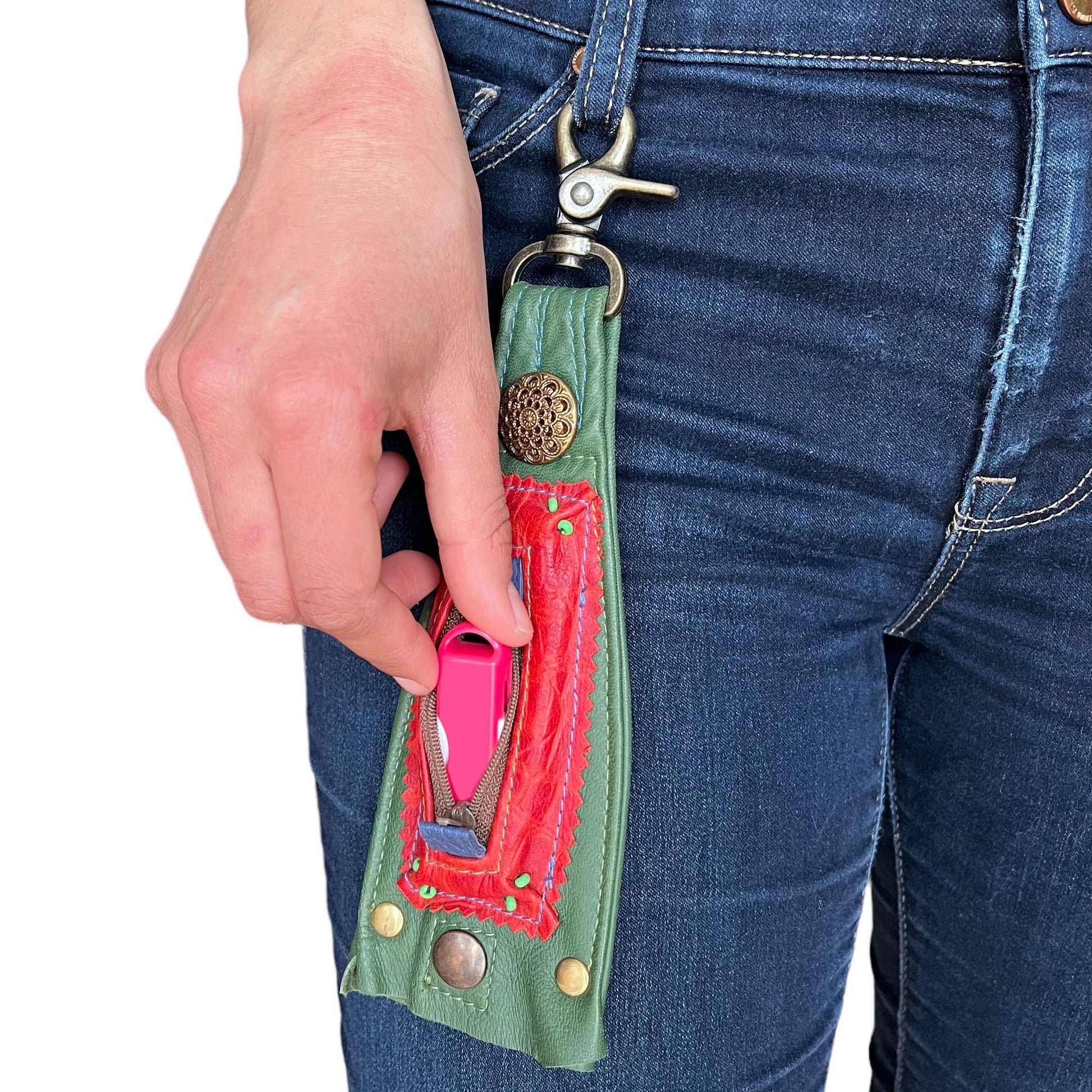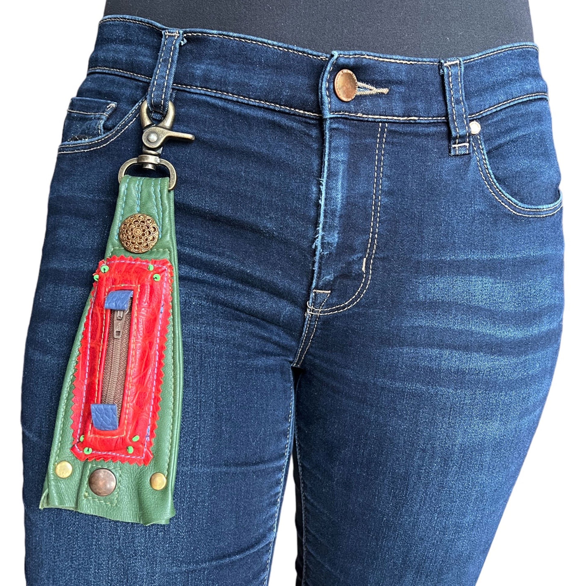 This one of a kind green zipper Zephr Talisman pouch attachable is a handmade key ring spring hook to travel with by attaching onto your jeans or bag. I really like the feel and the size of this key fob design.