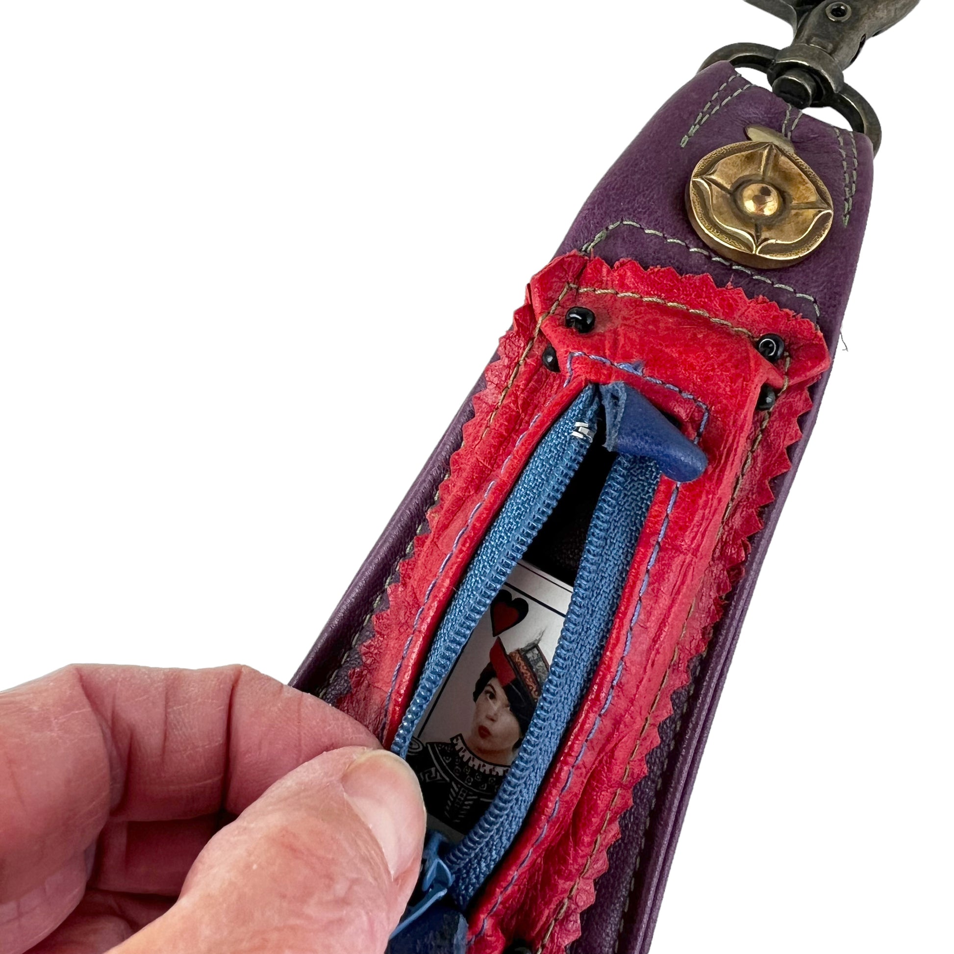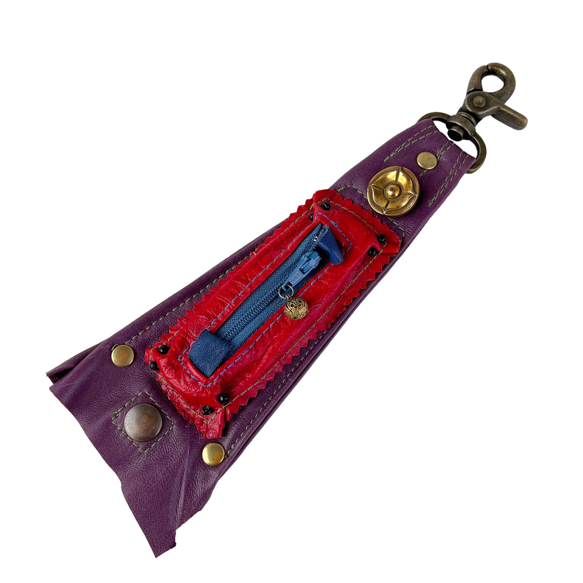 This one of a kind purple zipper Zephr Talisman pouch attachable is a handmade key ring spring hook to travel with by attaching onto your jeans or bag. I really like the feel and the size of this key fob design.