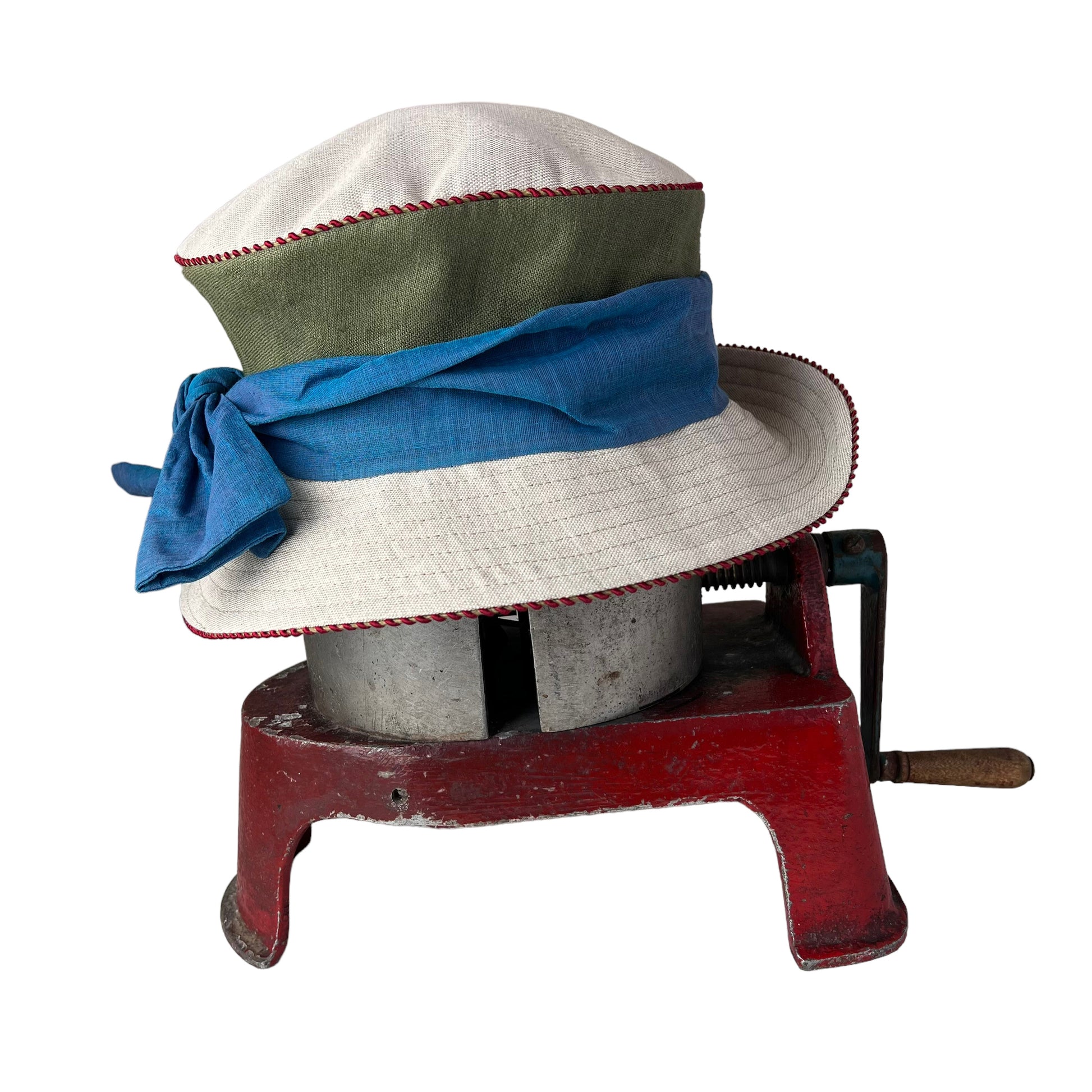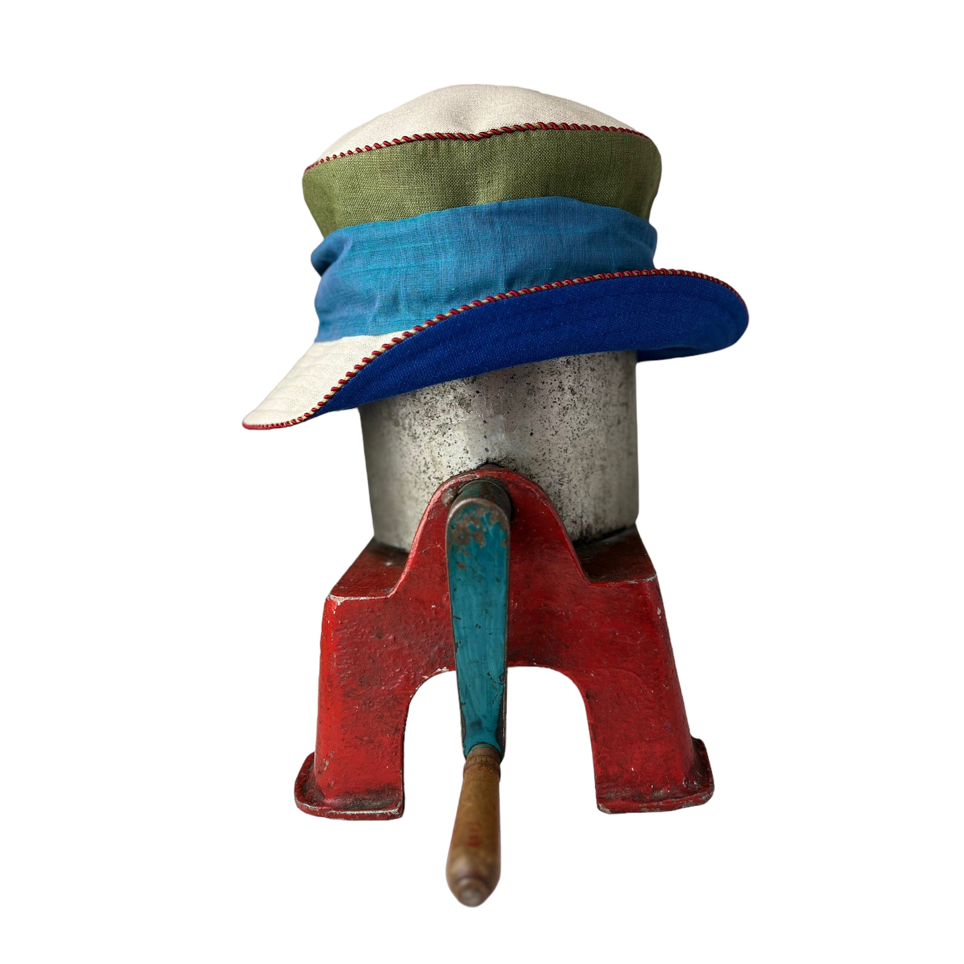 Named "The Zinnia" this casual wide rim summer design has been hand cut from linen fabric. The band and lower rim is made from a royal blue and olive color linens and the top and upper rim from a heavier natural linen. The natural linen makes for a sun reflection to cool the head. The rim is top stitched. The lining is cut from a light weight cotton weave which makes the hat very breathable and eliminates hat hair. The finished shot blue white band scarf is made from a light weight cotton.