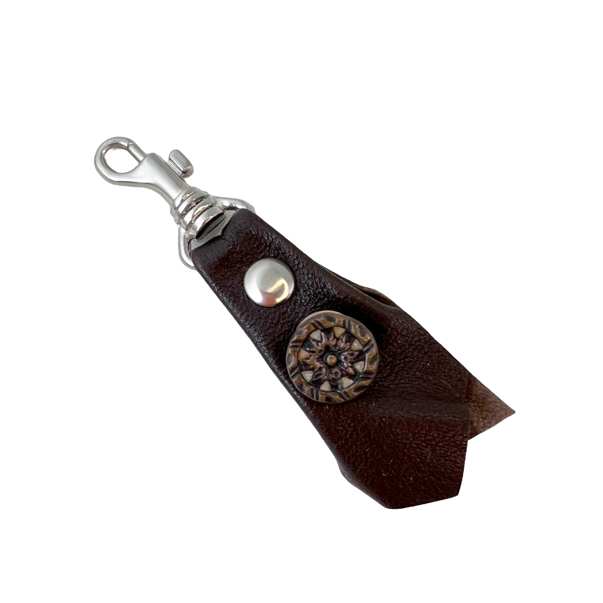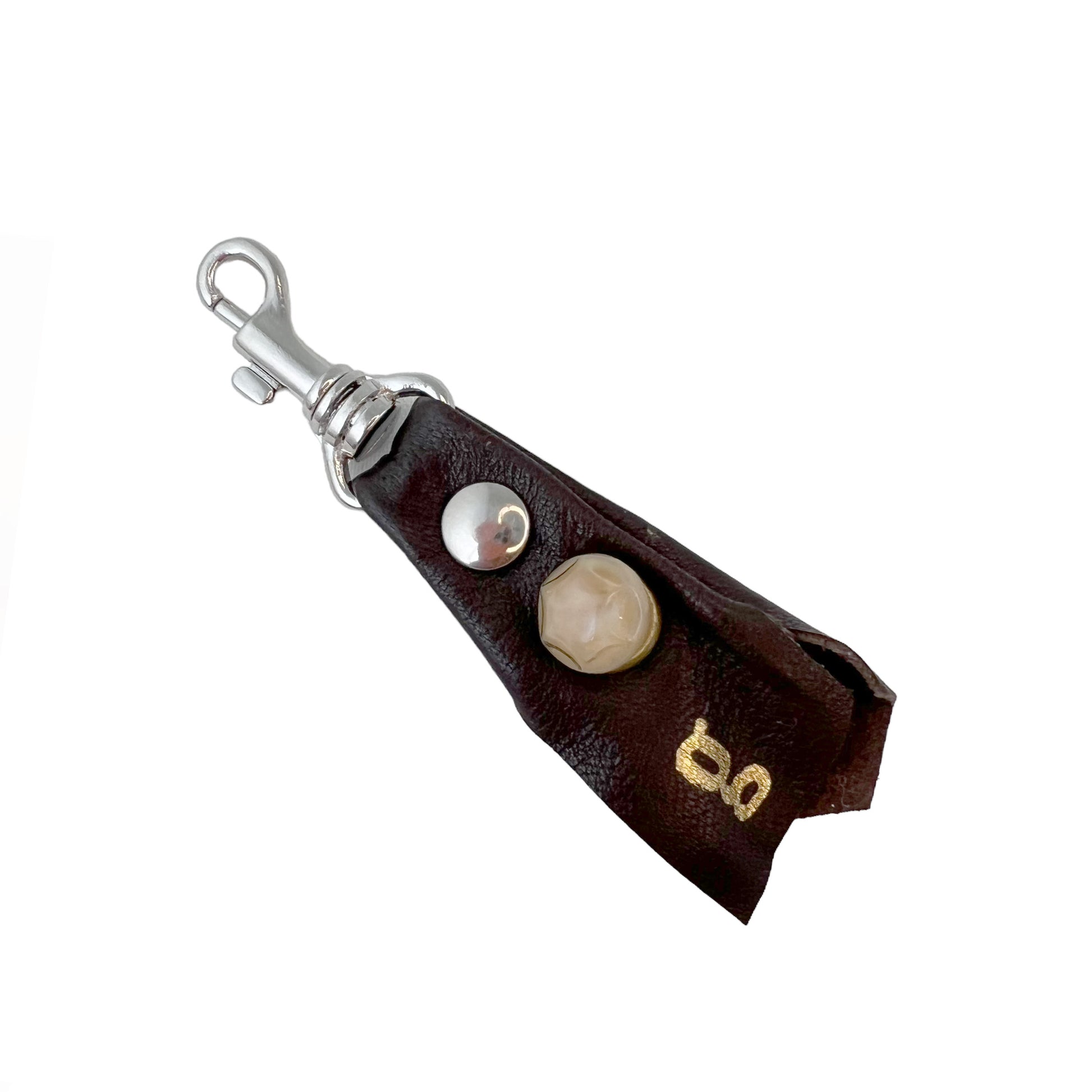 The lamb leather is wrapped through the silver metal spring hook and riveted in place. A single grommet is the embellishment filled with several antique buttons. The front has a antique metal button and the back with a small moon glow glass button. Both are circa early 1900s. The back of the fob is finished with a gold foil "g".
