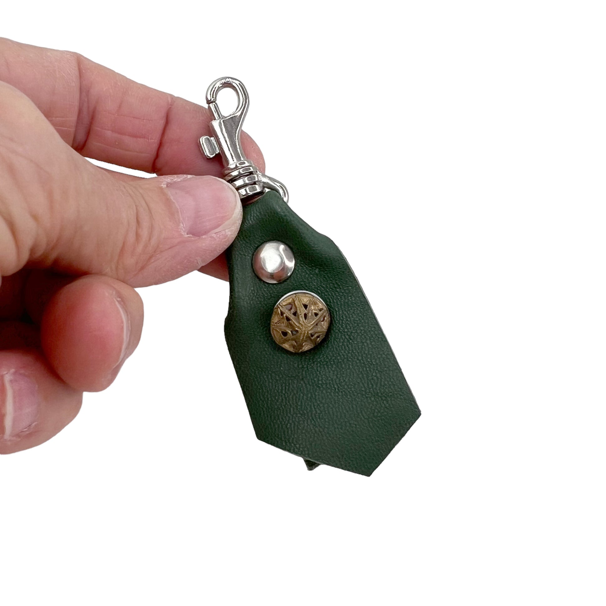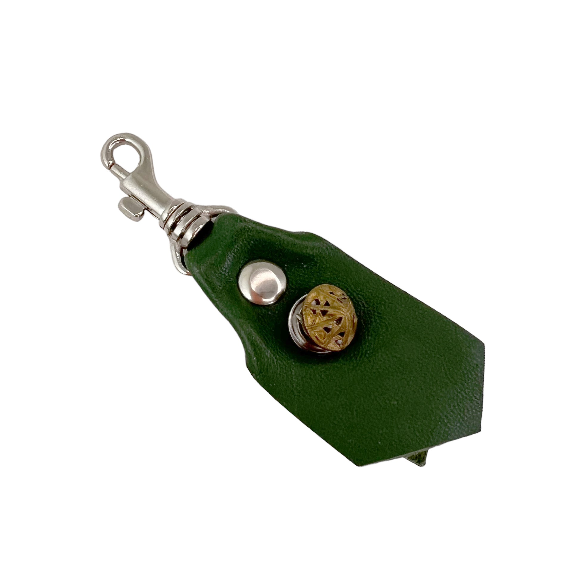 The lamb leather is wrapped through the silver metal spring hook and riveted in place. A single grommet is the embellishment filled with several antique buttons. The front has a metal filgree button and the back with a small oval brown glass button. Both are circa early 1900s. The back of the fob is finished with a gold foil "g".