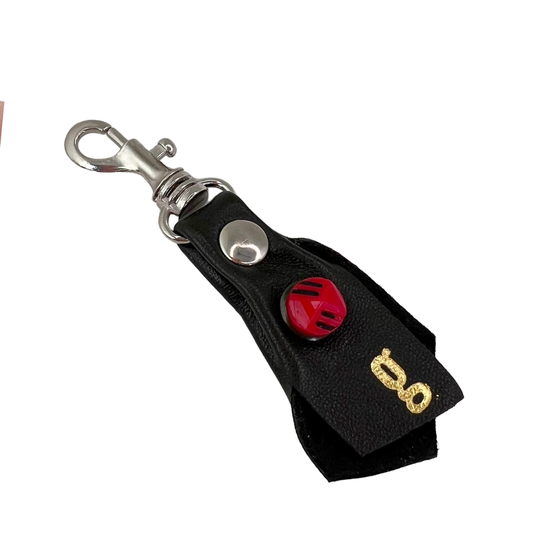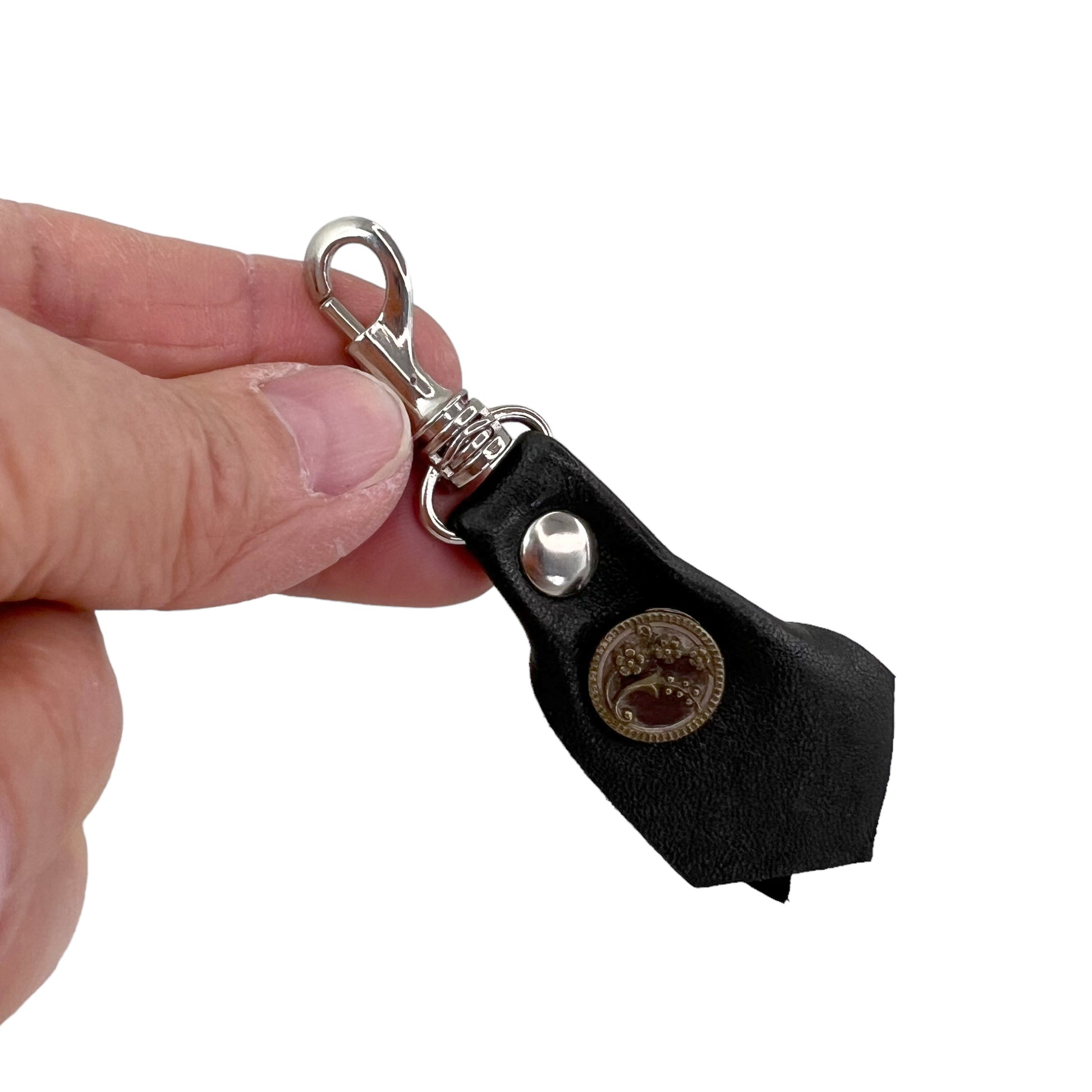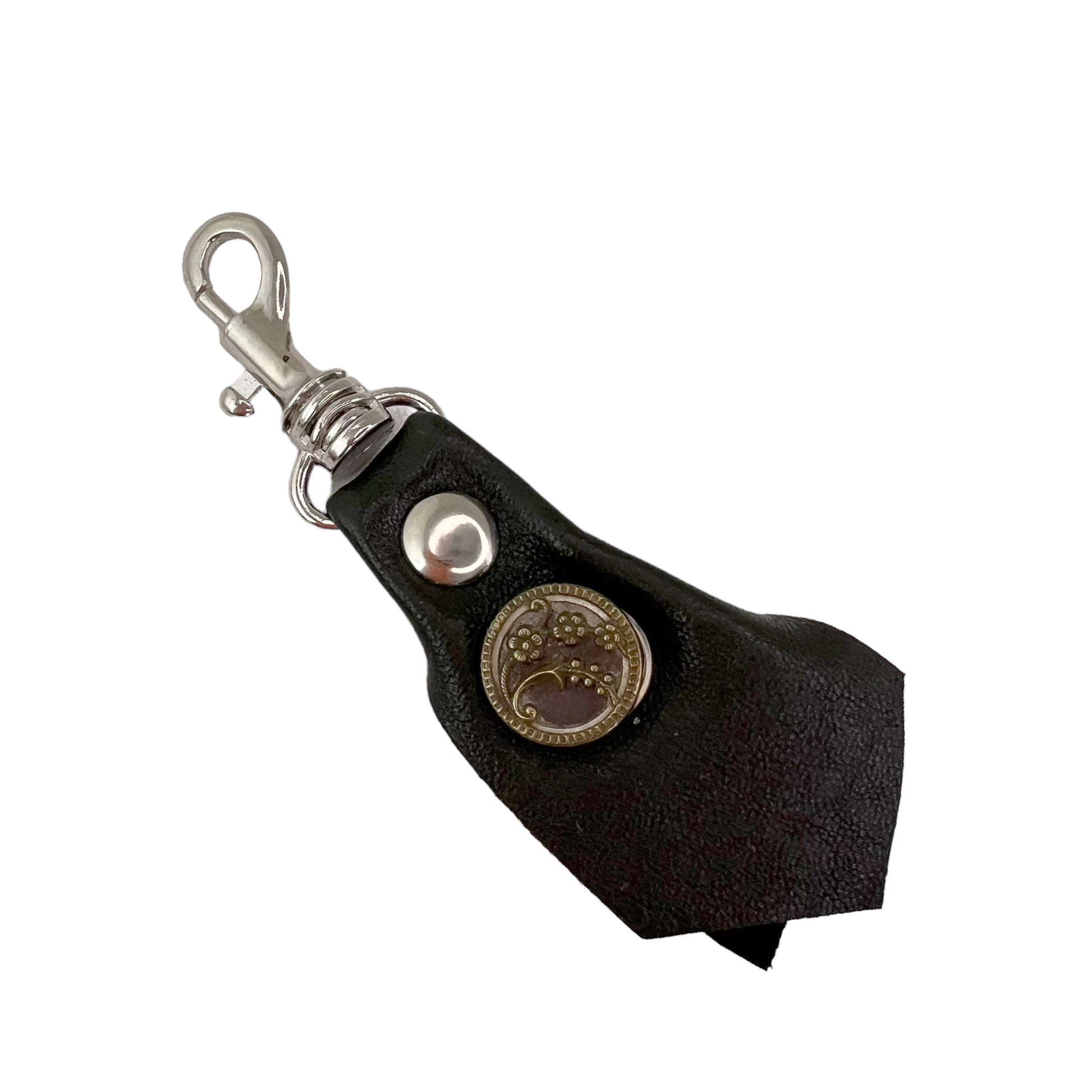The lamb leather is wrapped through the silver metal spring hook and riveted in place. A single grommet is the embellishment filled with several antique buttons. The front has a metal floral picture button and the back with a small red glass button. Both are circa early 1900s. The back of the fob is finished with a gold foil "g".