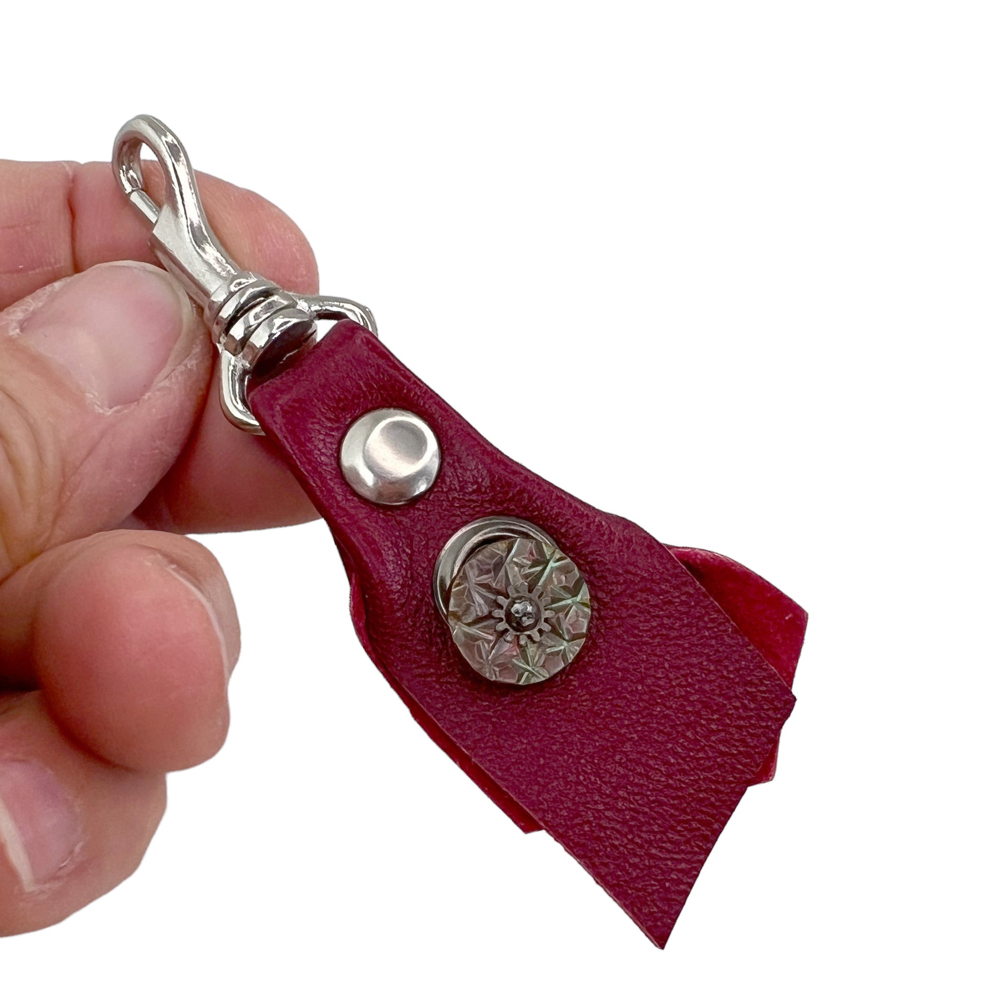 The lamb leather is wrapped through the antique metal spring hook and secured with a brass rivet. A single grommet is the embellishment filled with several antique buttons. The front has a carved shell button and the back with a luster glass button. Both are circa early 1900s. The back of the fob is finished with a gold foil "g".